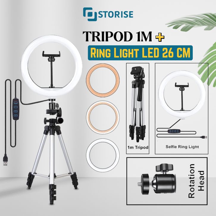 Paket Komplit Tripod 1 Meter + Ring Light 26 CM Stand HP Live Stream TikTok Selfie Make Up Vlog Lampu