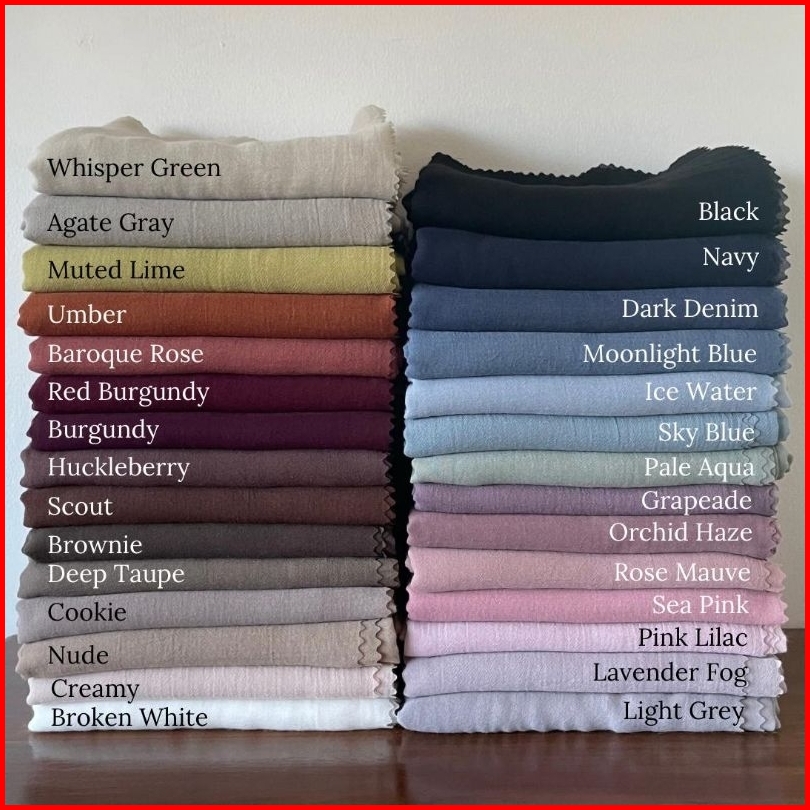 Black, Blue Black, Navy, Army, Dark Denim, Moonlight Blue, Sky Blue, Ice Water, Pale Aqua, Muted Lime, Whisper Green, Agate Gray, Light Grey, Cookie, Nude, Deep Taupe, Brownie, Huckleberry, Scout, Umber, Baroque Rose, Burgundy, Red Burgundy, Grapeade, Lavender Fog, Orchid Haze, Sea Pink, Rose Mauve, Pink Lilac, Creamy, Broken White
