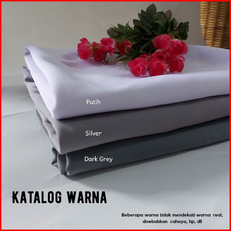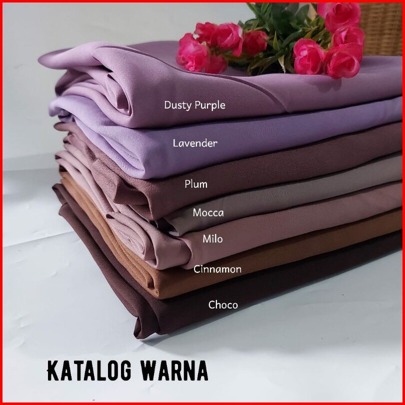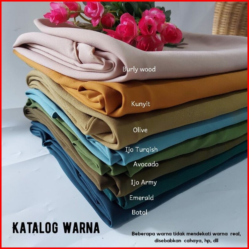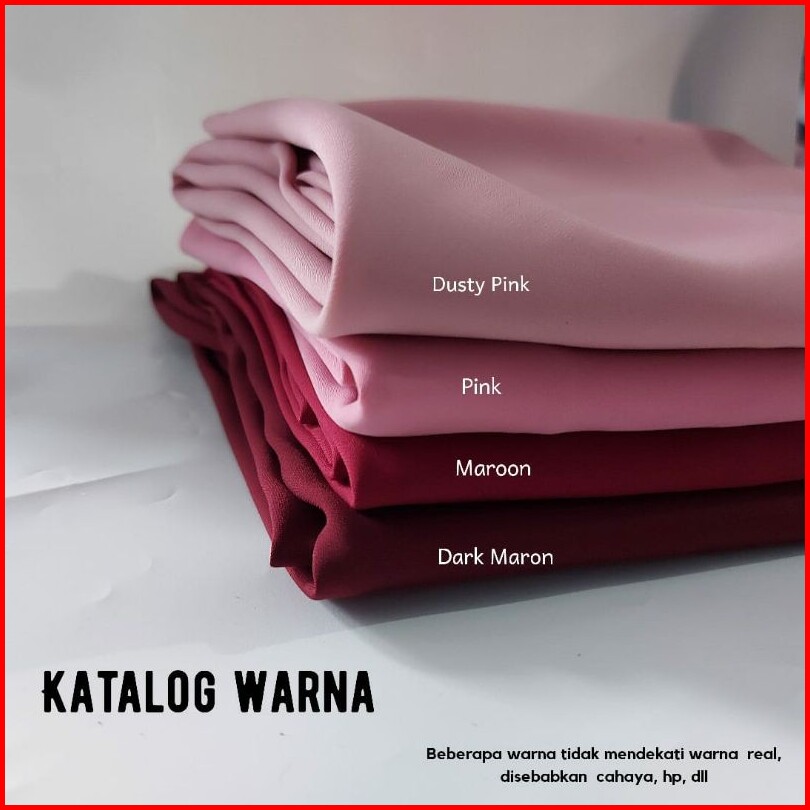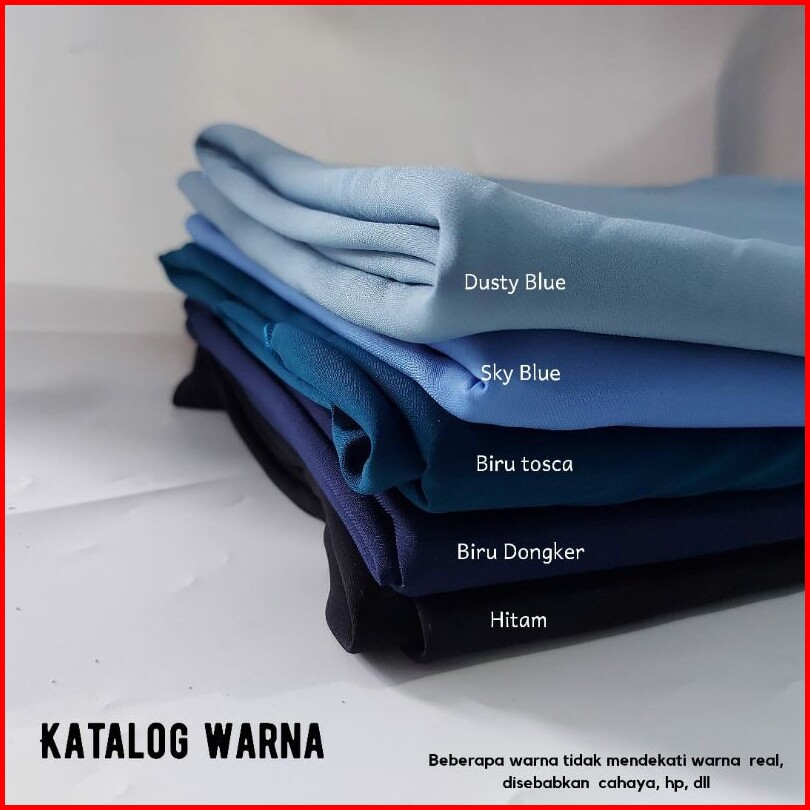 Hitam, Merah cabe, Botol, Dongker, Silver, Dark Grey, Mocca, Army, Dusty Blue, Dusty Pink, Milo, Emerald, Choco, Turqise, Putih, Kunyit, Plum, Purple, Cinnamon, Dark maroon, Pink, Dusty purple, Avocado, Eggplant, Lemon, Orchid, Rauge, Fossil grey, Ijo tosca, Ash grey, Warna request