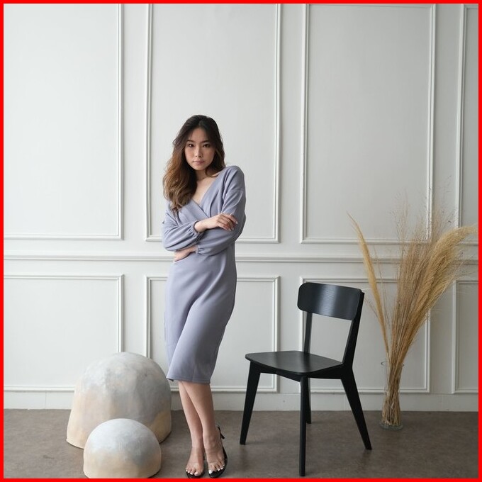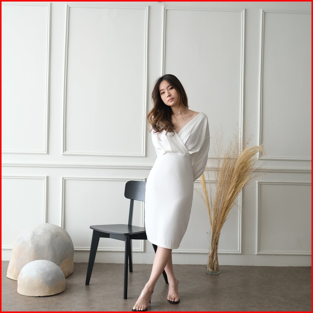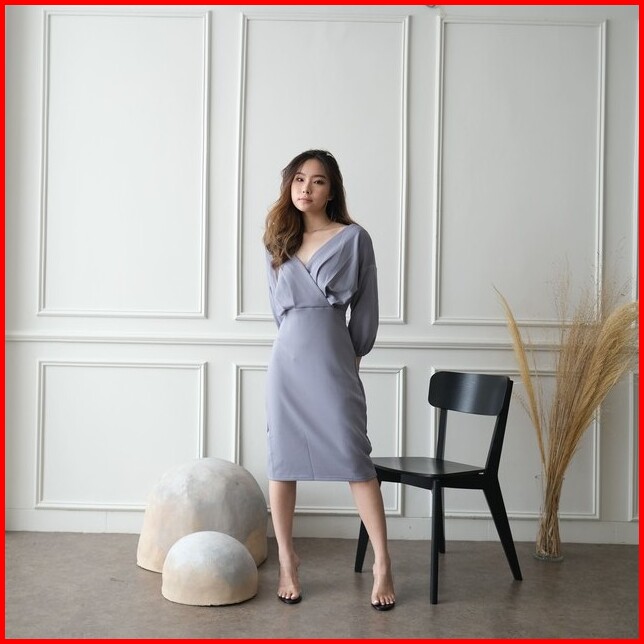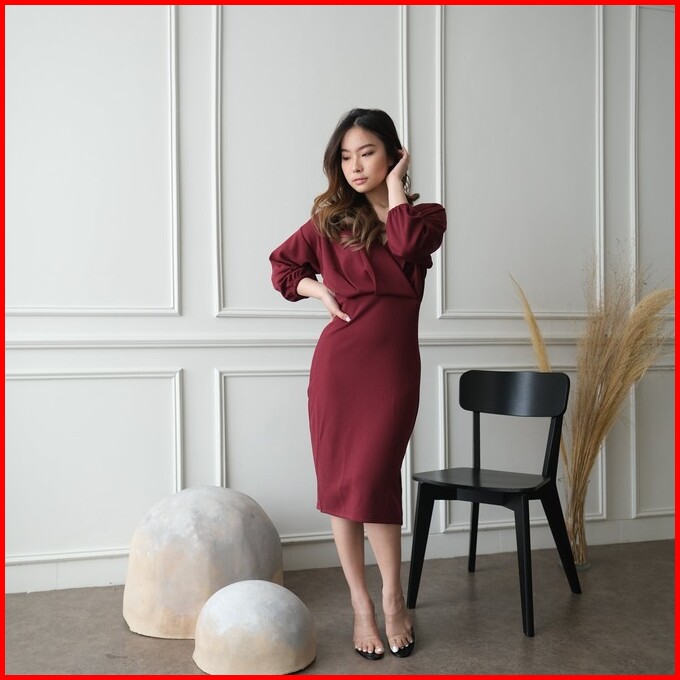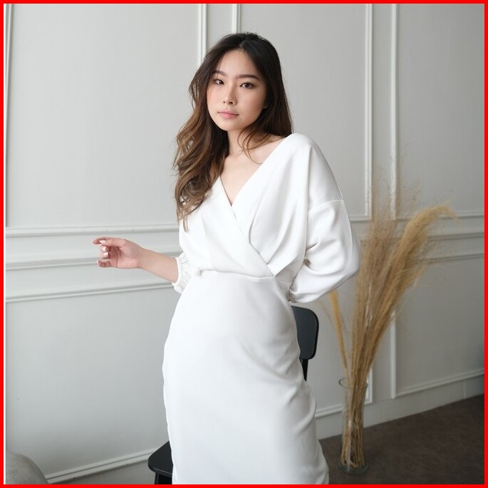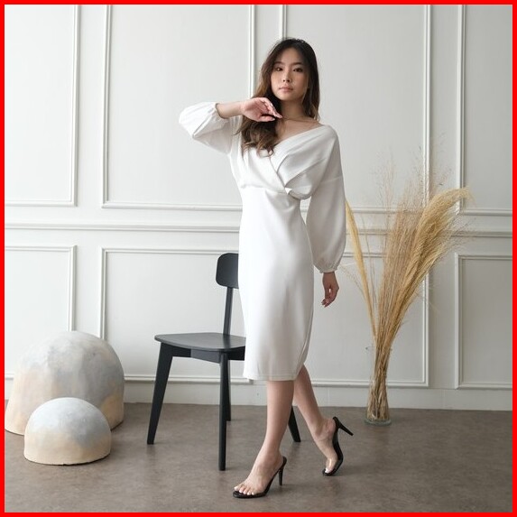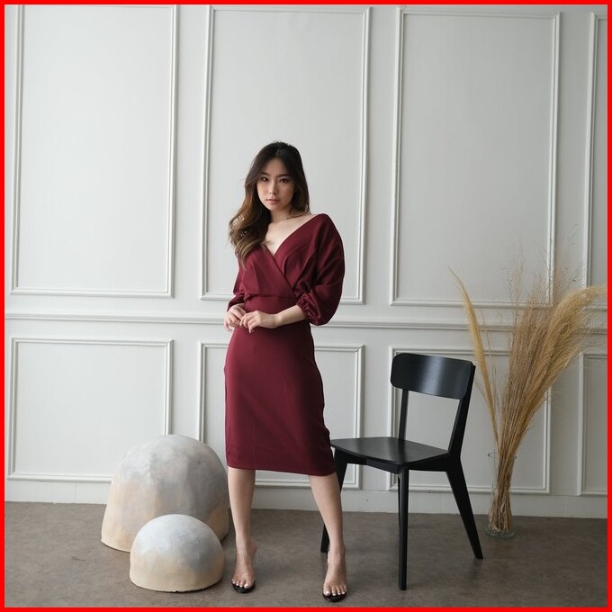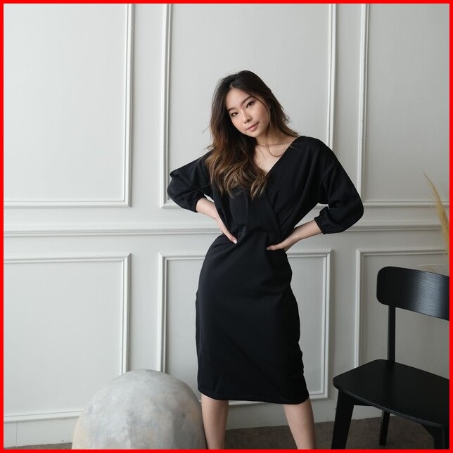 Kiyorawears - Sella Dress Dress V Neck Wanita Midi Dress Korean Style