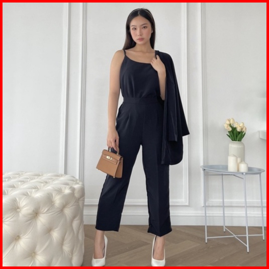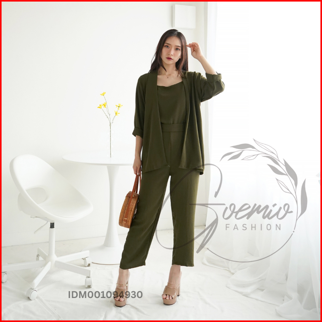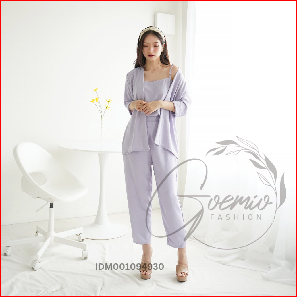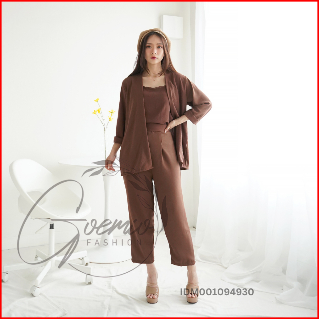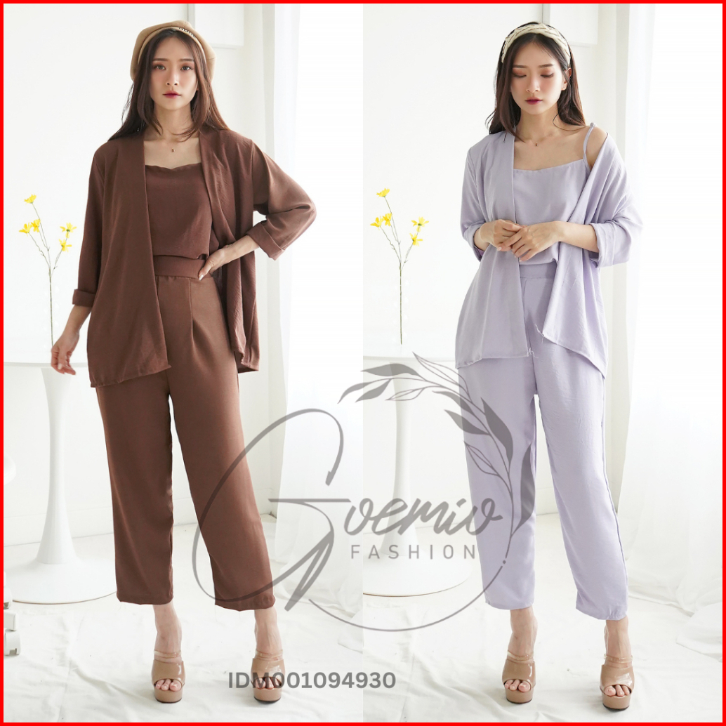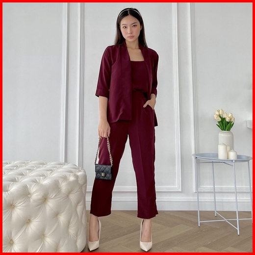 Ilook Hana 3 In 1 Set Blazer Lengan 3 4 Celana Panjang Crinkle Setelan Formal Wanita Atasan Simple Linen Casual Baju