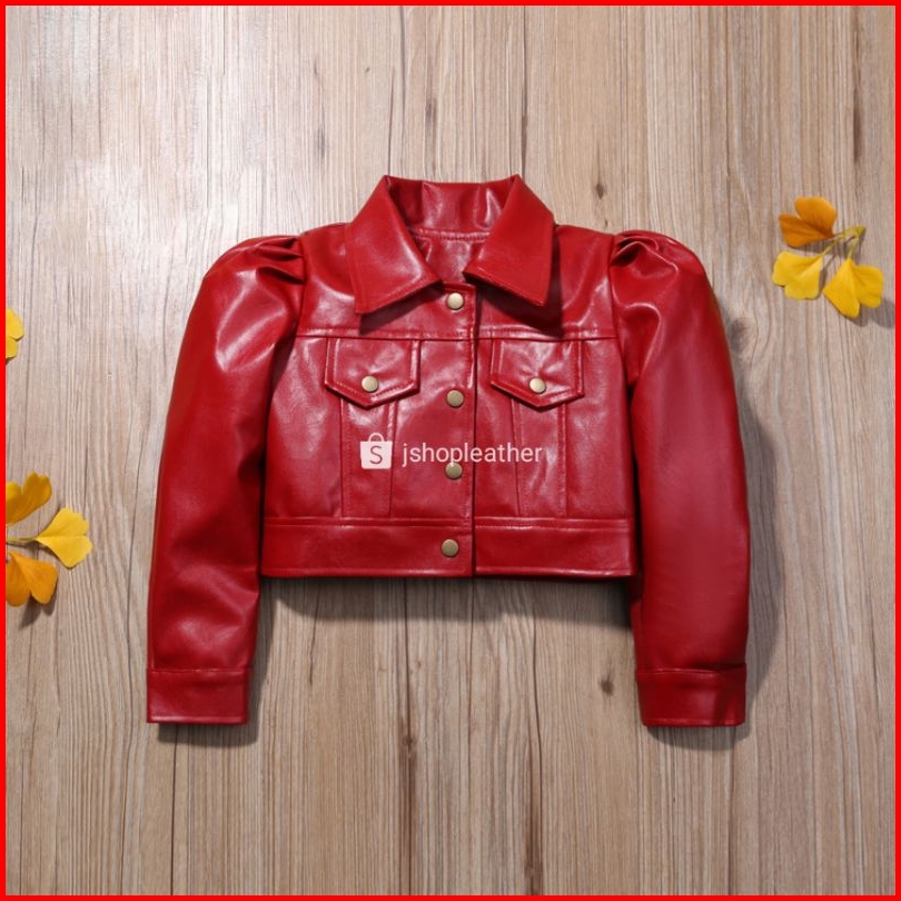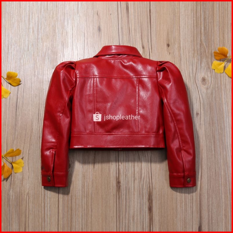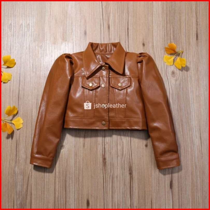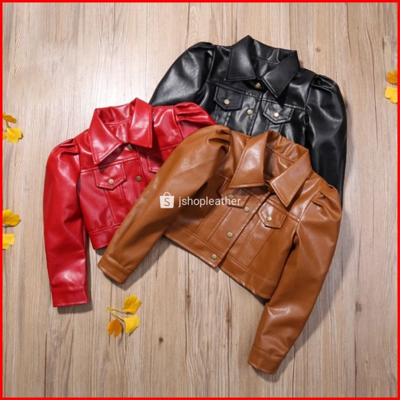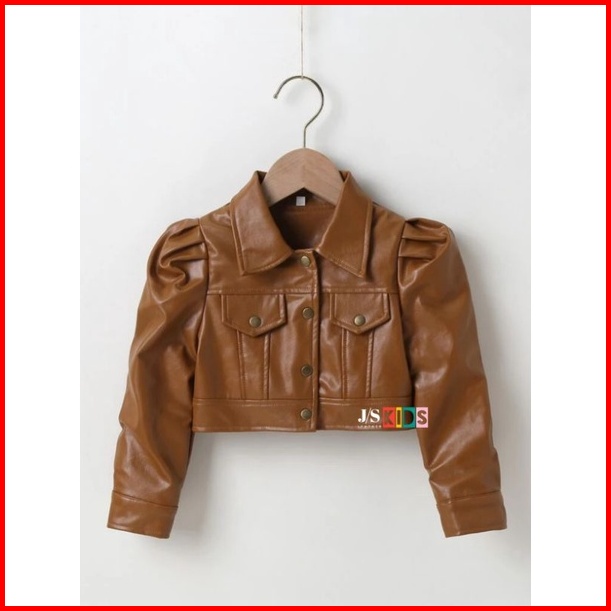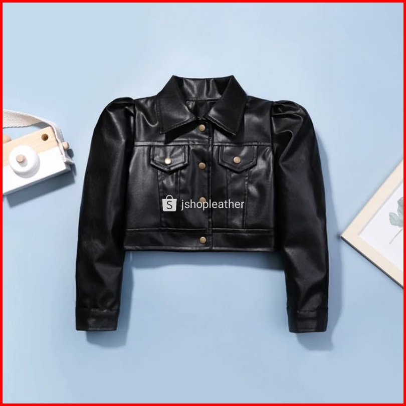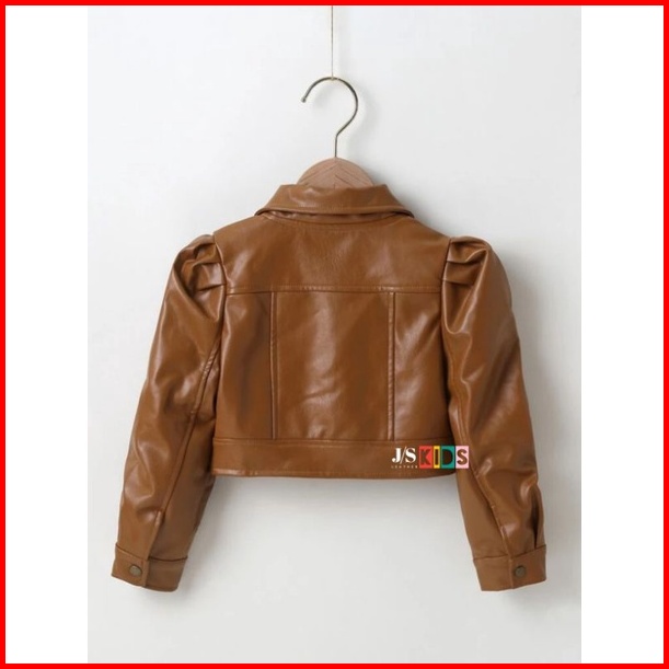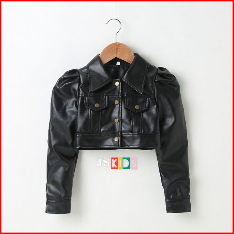 Jaket Crop Anak Perempuan Lengan Puff Jaket Kulit Pu Gaya Korea Usia 1-8 Tahun