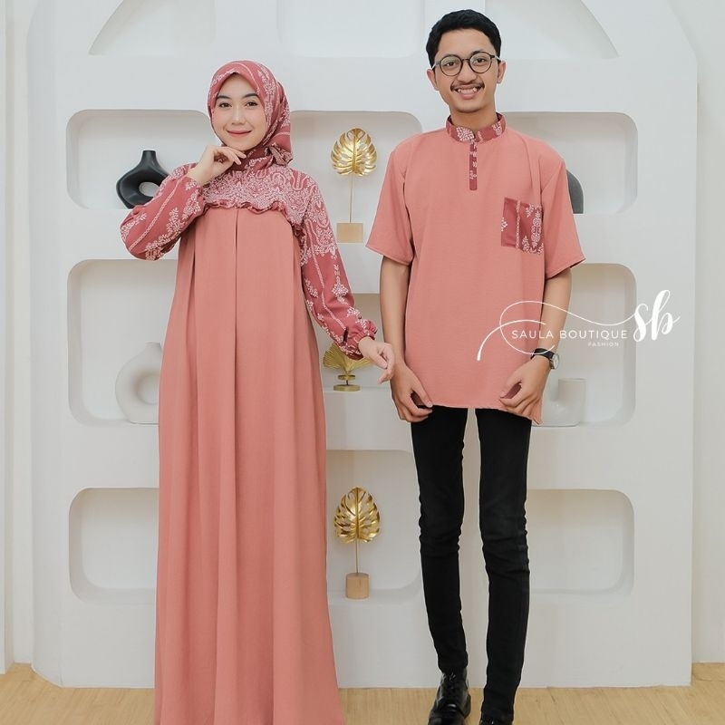 COUPLE SET GAMIS KANAYA DAN KEMEJA KEENAN BAHAN CRINGKLE MIX CERUTY PRINTING MOTIF TERLARIS- BAJU COUPLE LEBARAN