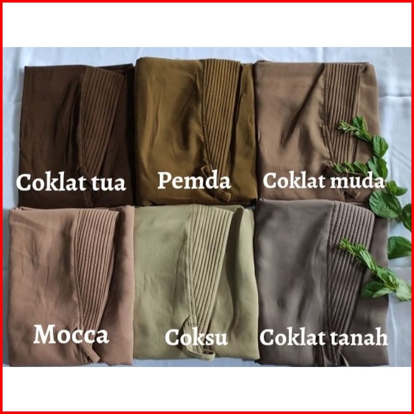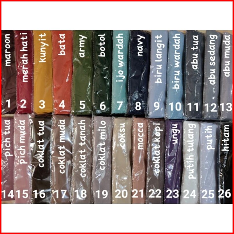 Coksu, Cream, Lavender, Ijo wardah, Army tua, Cokelat Tua, Navy, Abu muda, Hitam, Kunyit, Abu Tua, Mocca, Putih, Coklat tanah, Maroon, Hitam keabuan