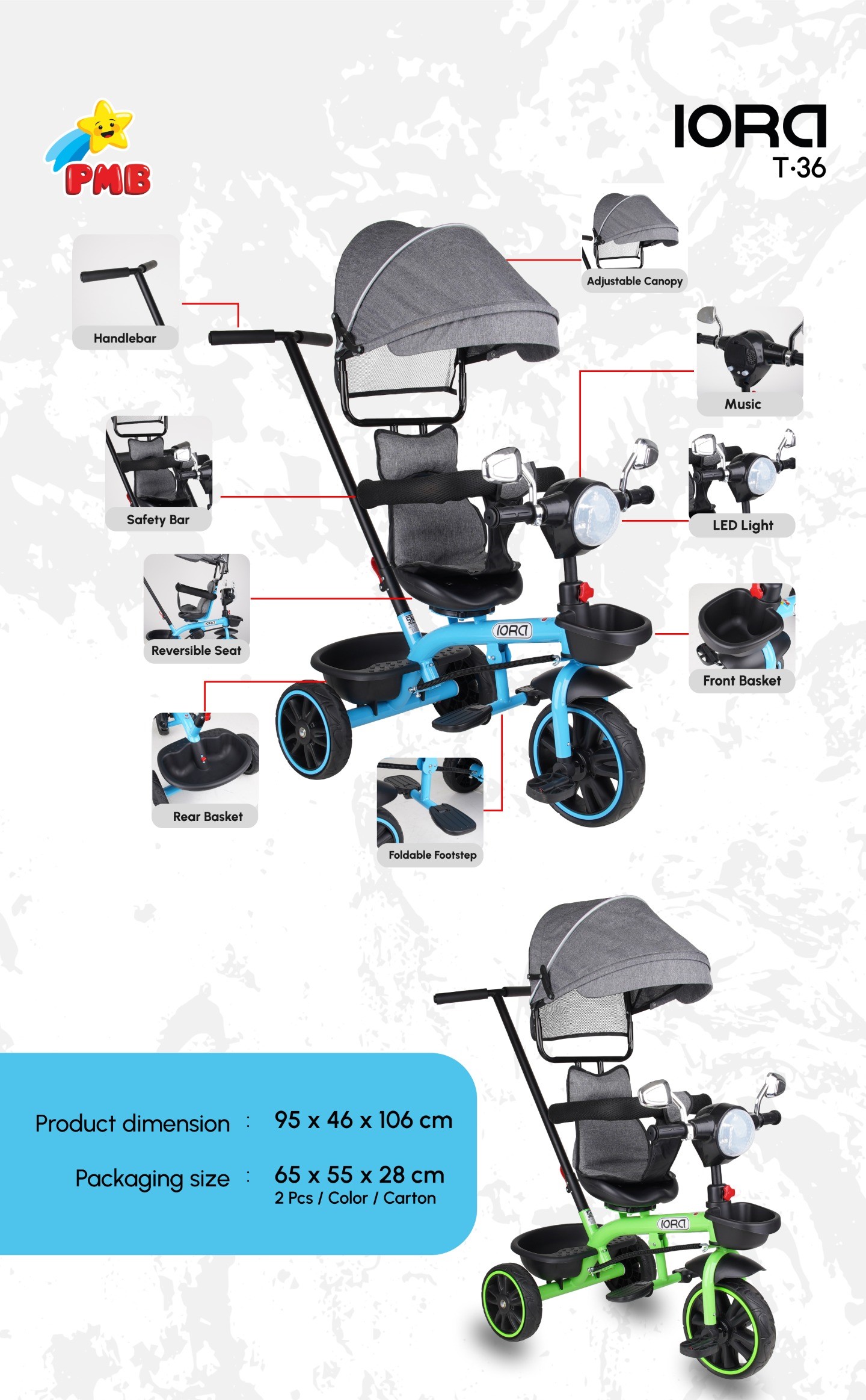 SEPEDA RODA 3 ANAK TRICYCLE IORA T36 T-36 SEPEDA KANOPI LED LIGHT MUSIC PMB TOYS
