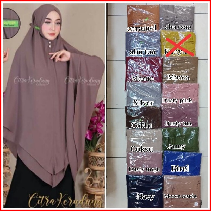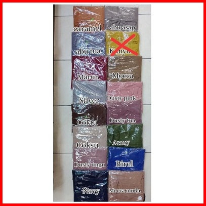 Hitam, Putih tulang, navy, Hijau Tua, coklat mocca, Mocca tua, Dusty ungu, Coksu, Abu Tua, Cokelat Tua, Marun, biru wardah, silver, Pink, kuning lemon, salem, Hijau botol, Putih bersih, Hijau olive, Baby pink, Caramel, Dusty Pink, Milo, Lilac, Merah ati, Hijau avokad, Ungu taro, Lavender, Kunyit, Hijau sage, Birel, Abu sma, Abu tanah, Bata, Ungu Tua, Denim, Army muda, Merah bata, Kuning lemon terang, Mint