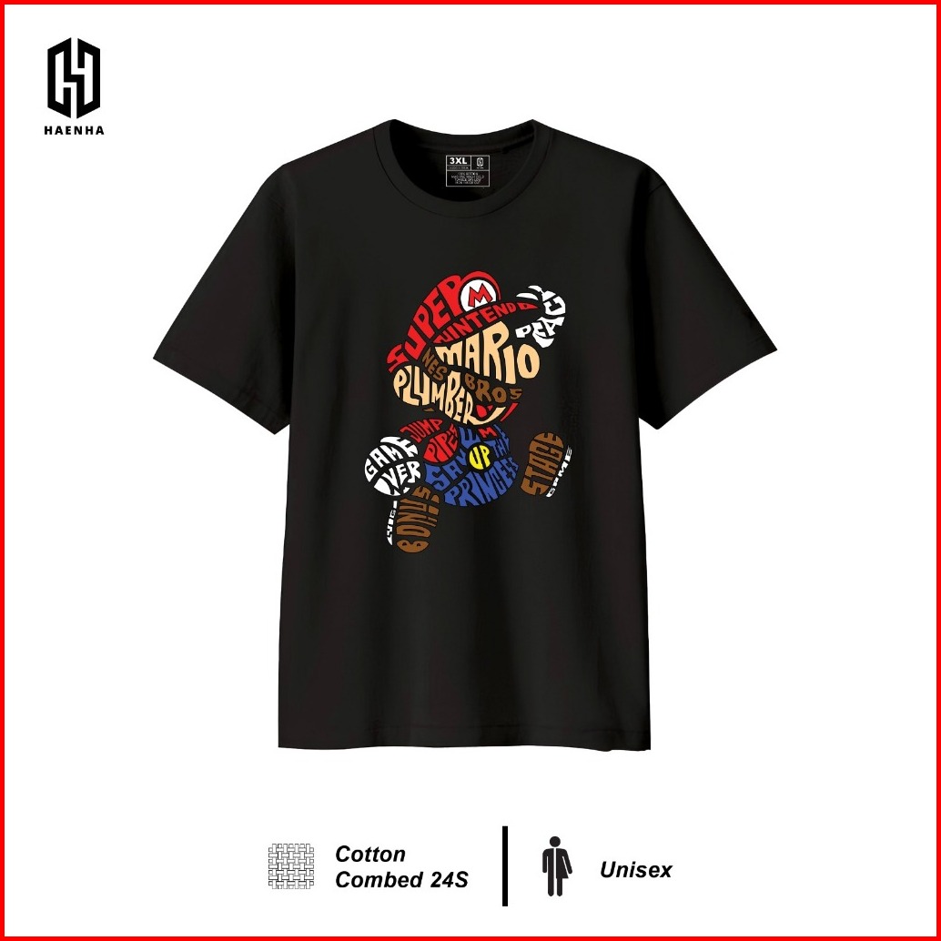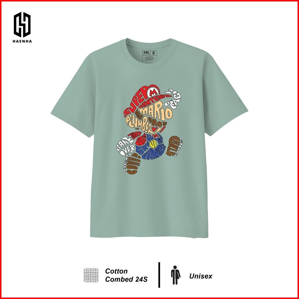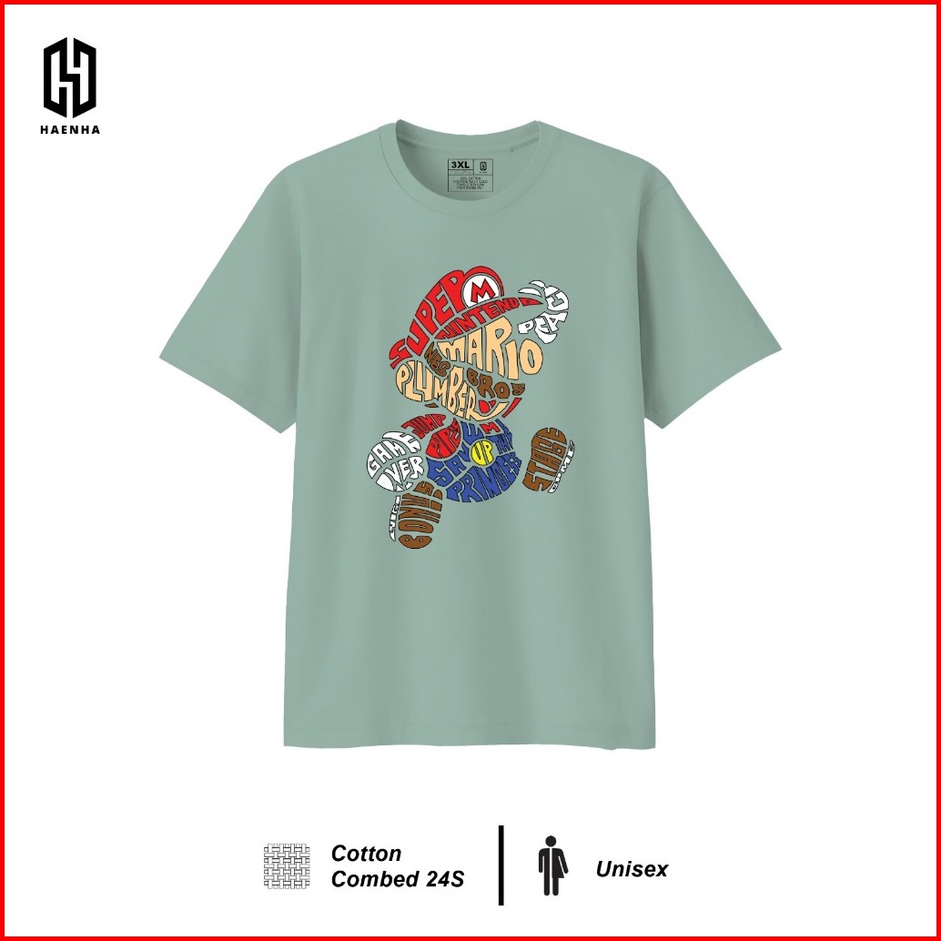 Haenha Mario Plumber Baju Kaos Distro - T Shirt Sablon Unisex Black White Sage Cream