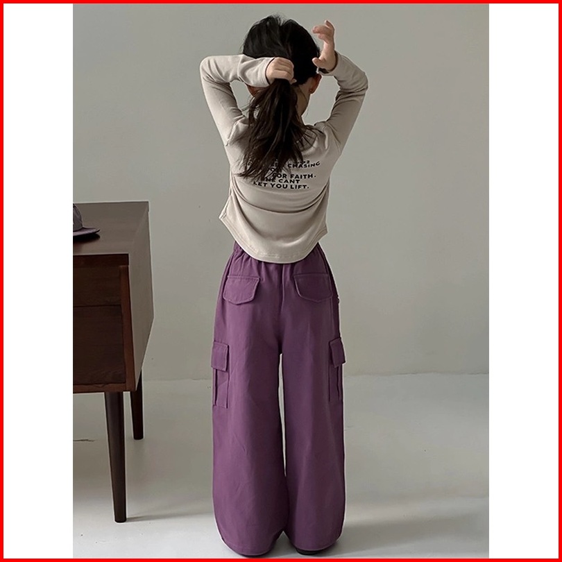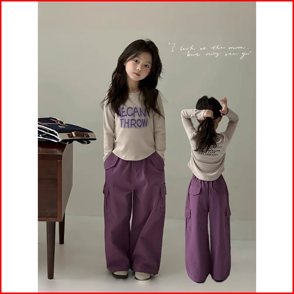 Set Anak Perempuan Oneset Anak Cewek Setelan Anak Perempuan Set Cargo Atasan Lengan Panjang Celana Panjang Warna Ungu Ba