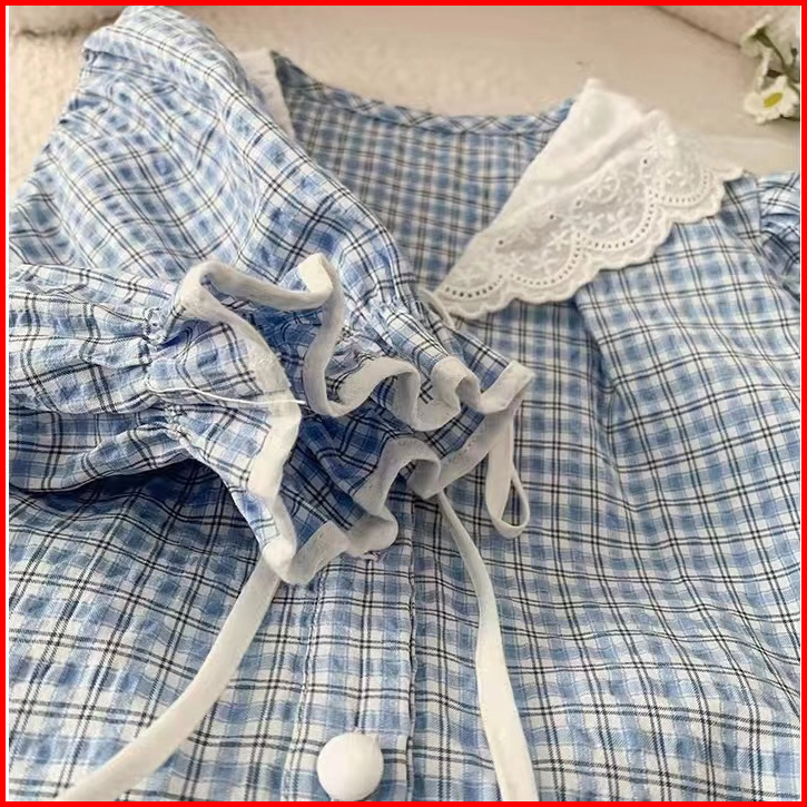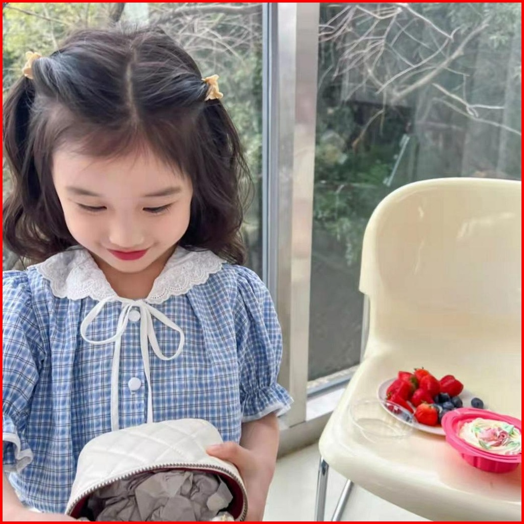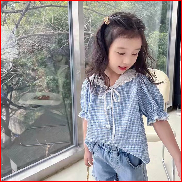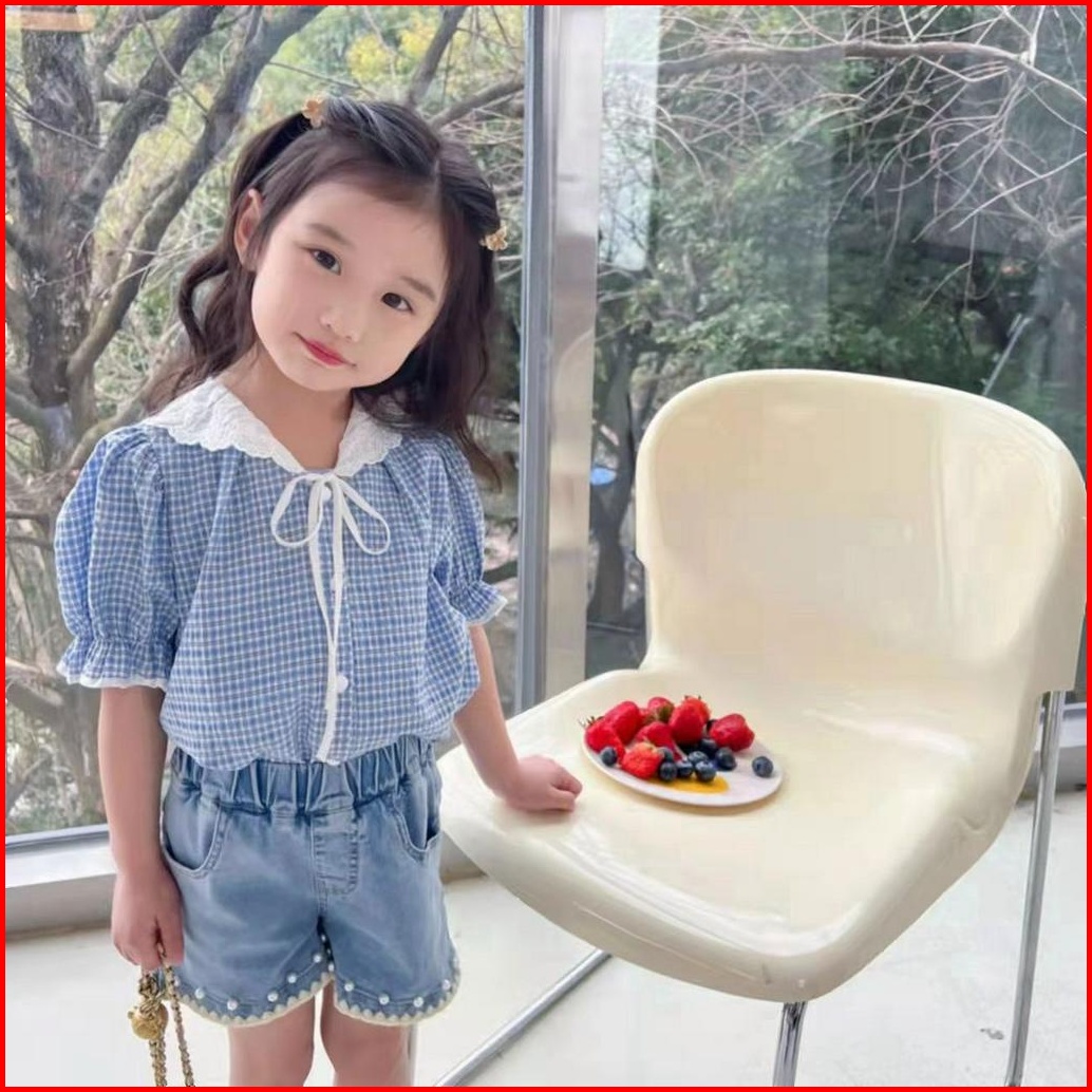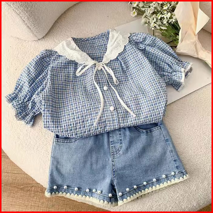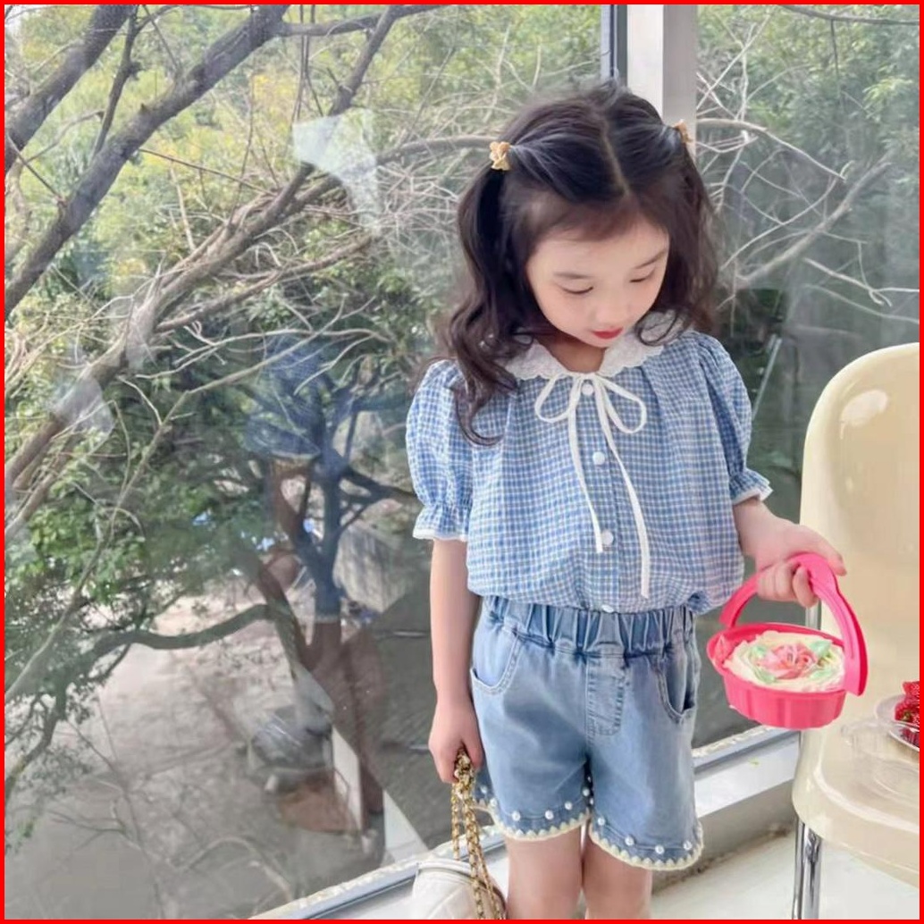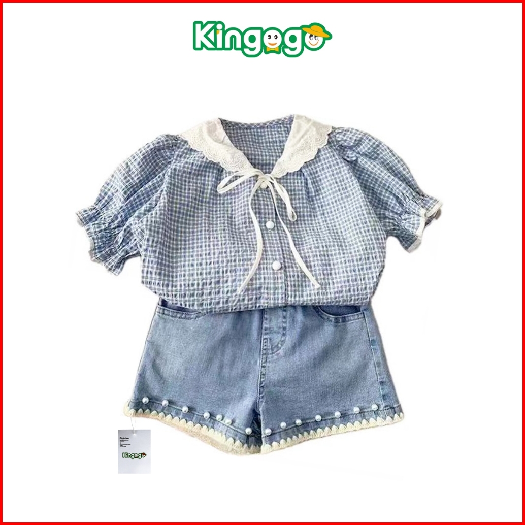 Kingogo Terbaru Setelan Anak Perempuan Kotak-kotak Kemeja Celana Pendek Dengan Mutiara Manis Setelan Anak Perempuan Baju
