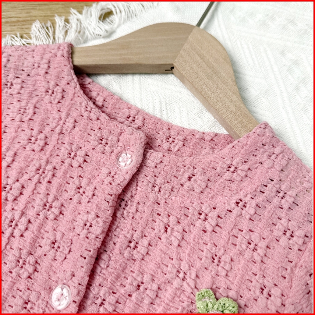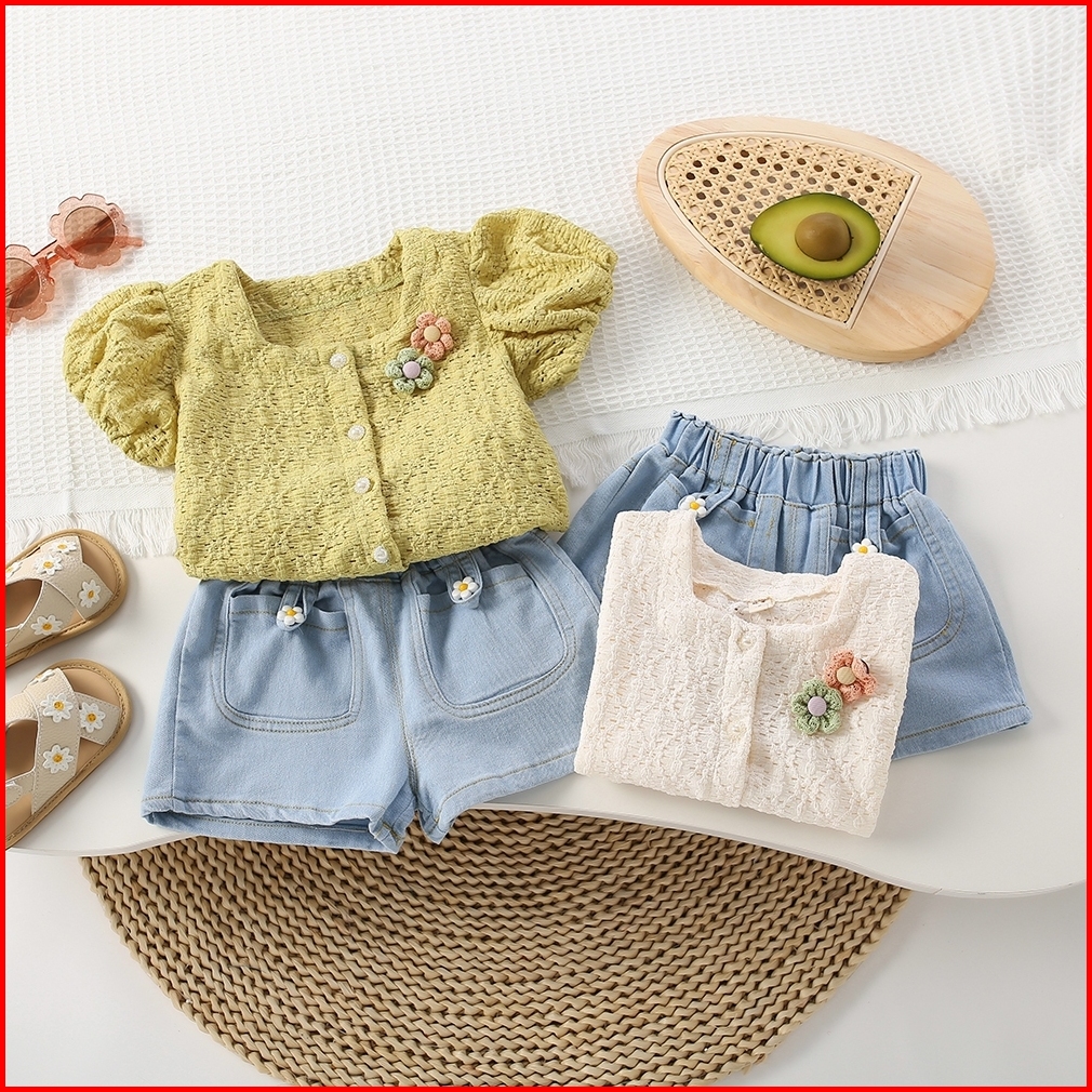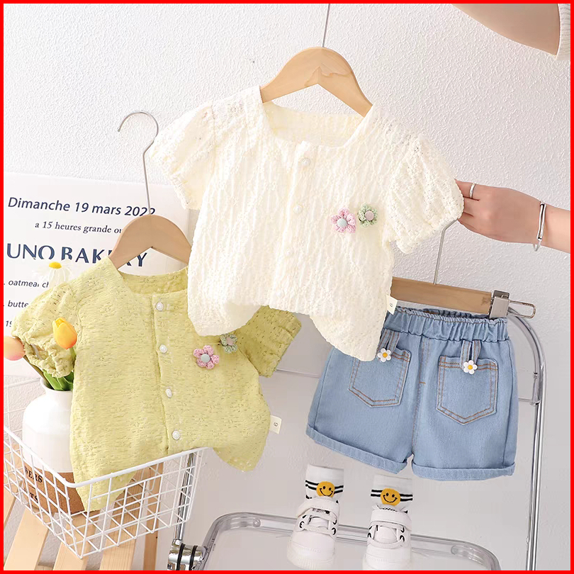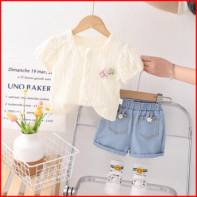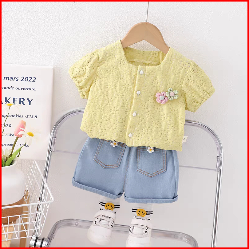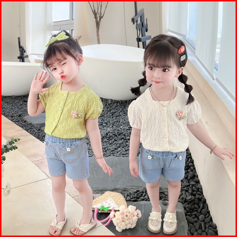 Futurestar Setelan Anak Perempuan Gaya Korea Kardigan Lengan Pendek Celana Pendek Denim Kasual Set
