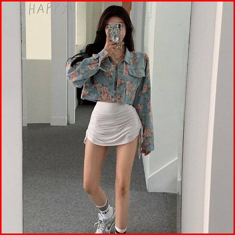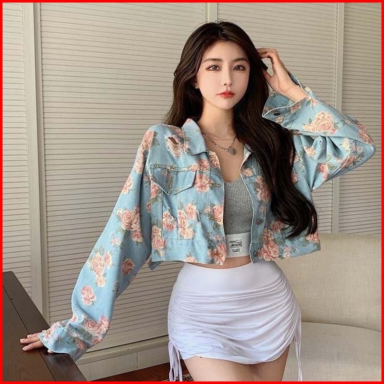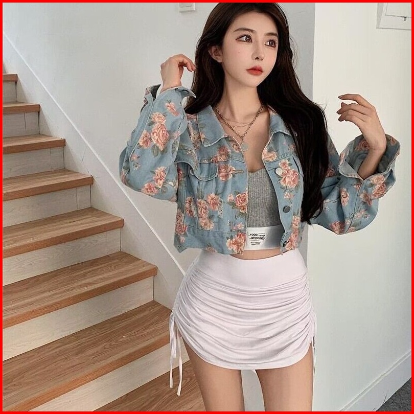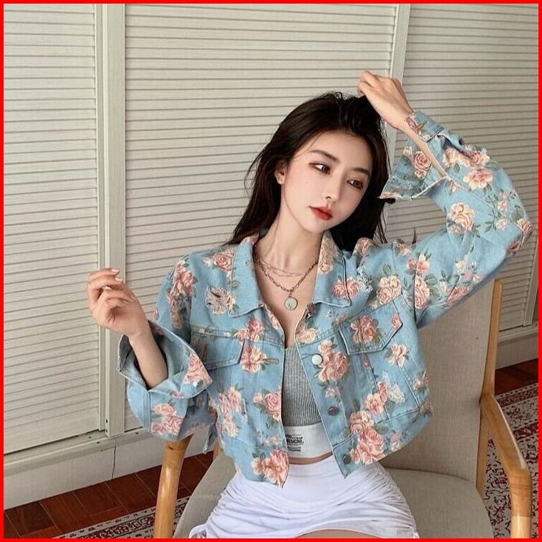 Nana Jaket Denim Cetak Mawar Retro Baru Dicuci Dengan Jaket Pendek Serbaguna Siswi 037