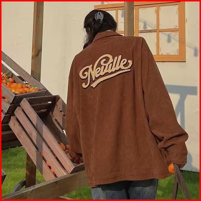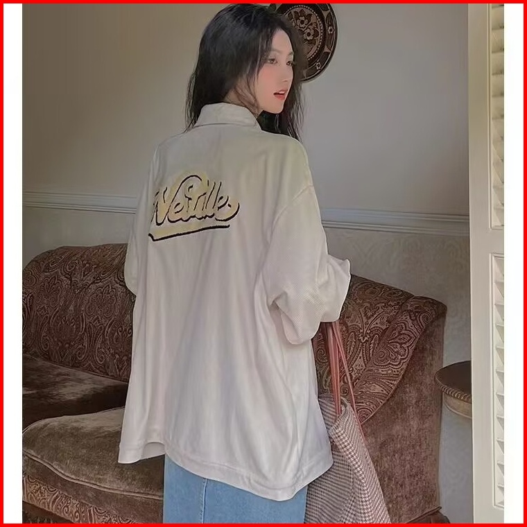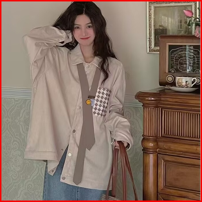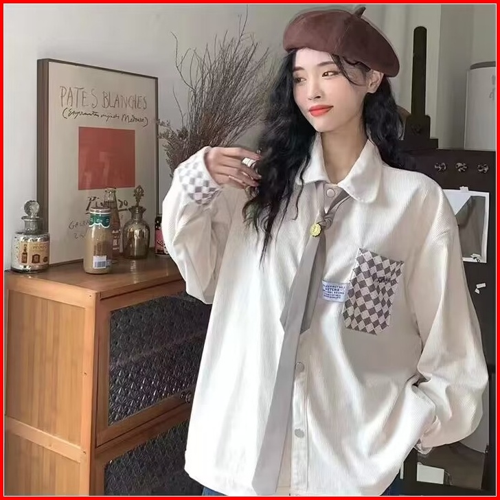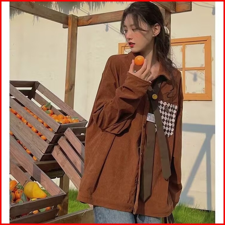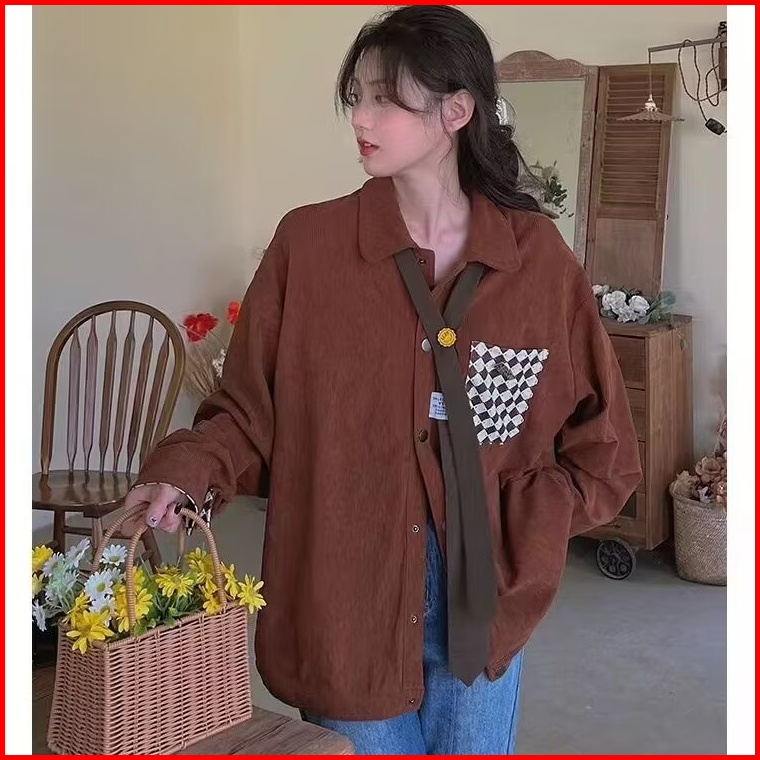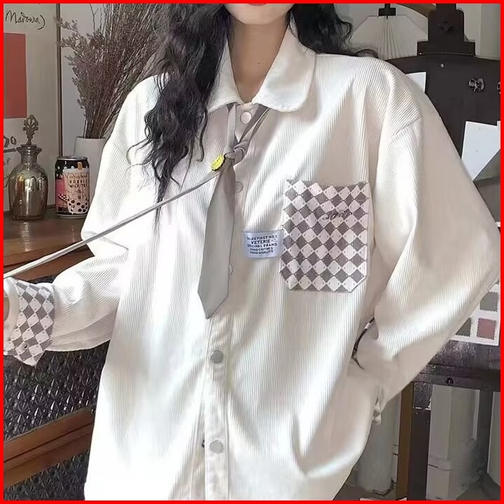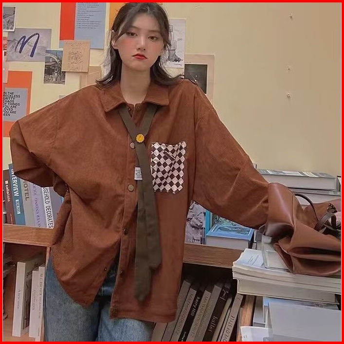 Kemeja Korduroi Wanita Atasan Kemeja Lengan Panjang Longgar Gaya Korea Termasuk Lencana Dasi