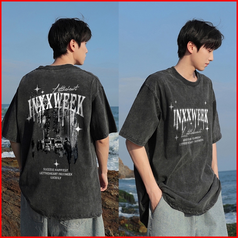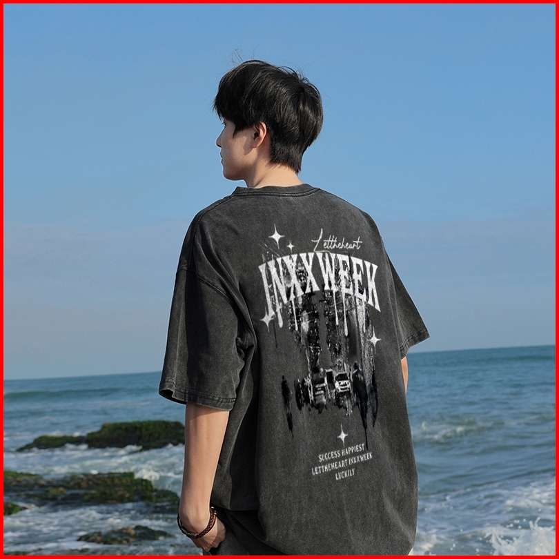 Puerto Washed Kaos Pria American Retro Trendy Brand Star Letters Baju Oversize Pria Street Style T-shirt Atasan Premium