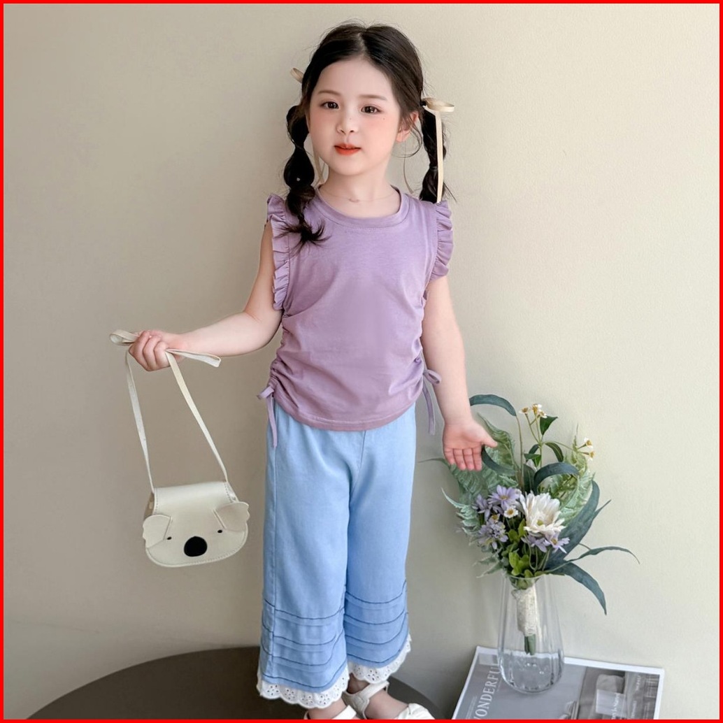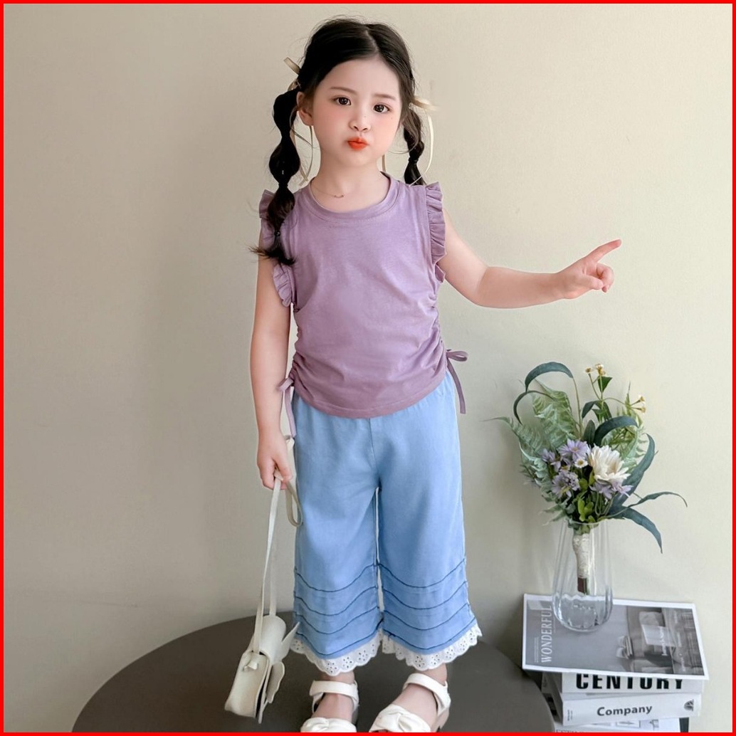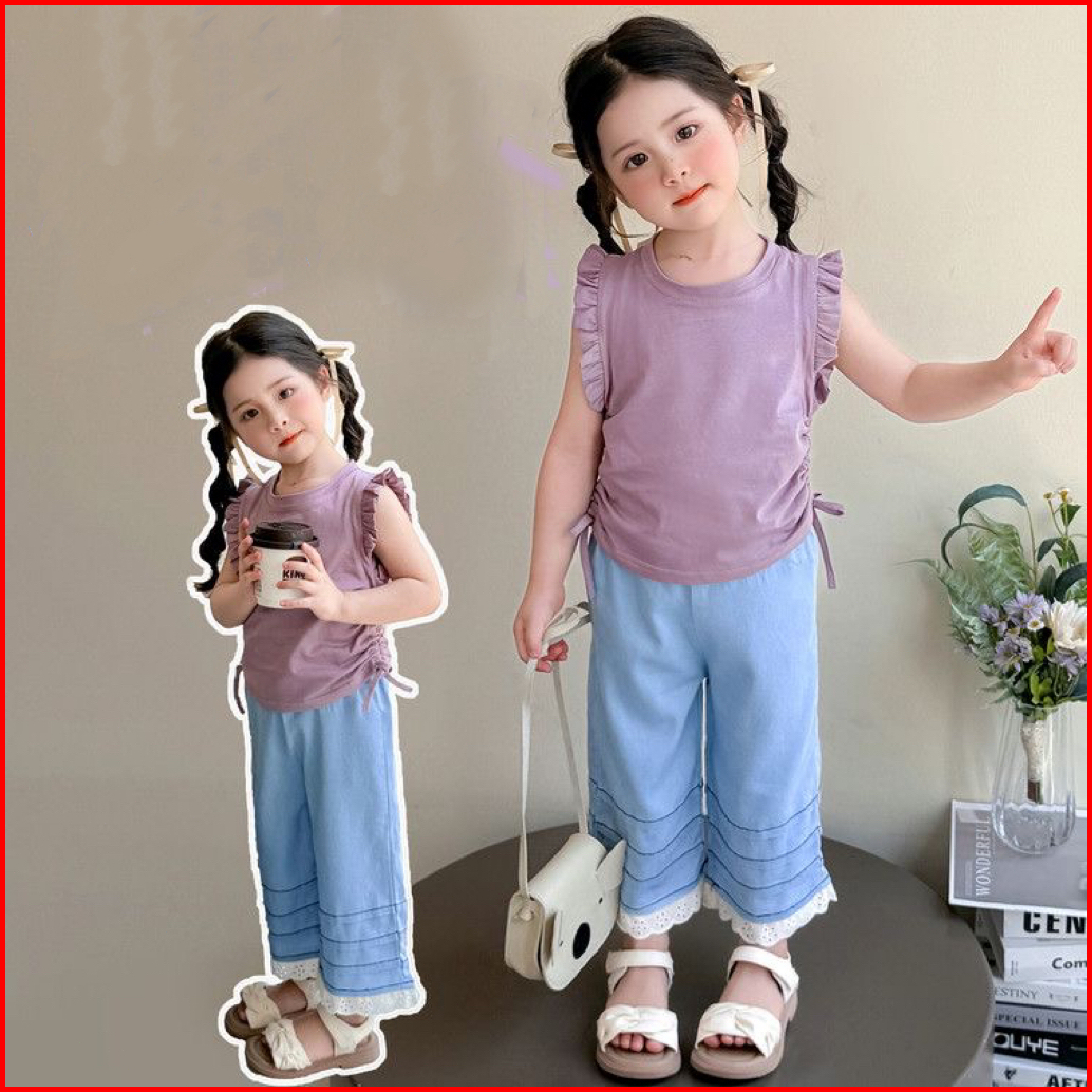 One Set Anak Cewek Setelan T-shirt Bahan Katun Celana Soft Jeans Anak Permpuan Set Anak Cewek Setelan Anak Perempuan Kor