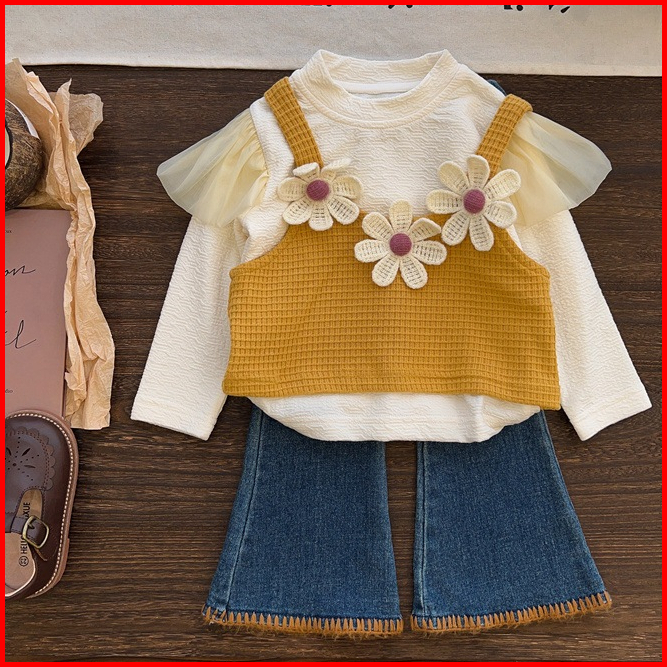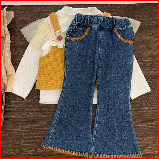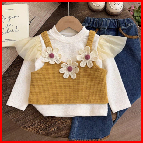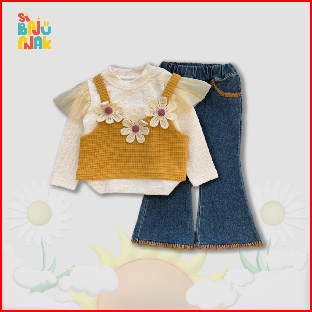 Si Baju Anak - Setelan Anak Perempuan 1-7 Tahun Set Kaos Putih Tanktop Kuning Celana Jeans- Bap-35