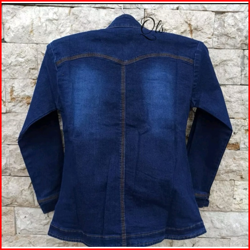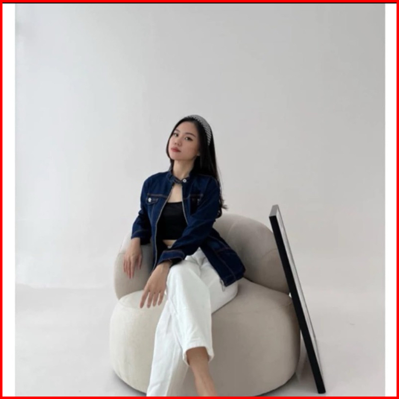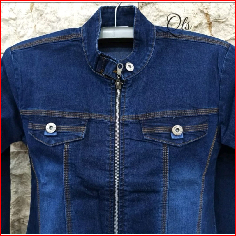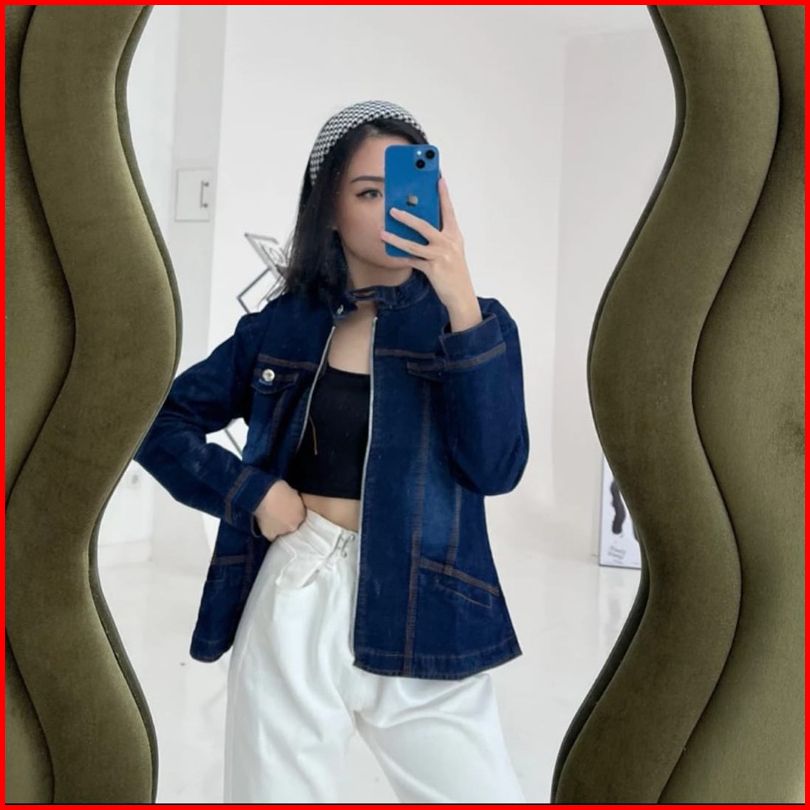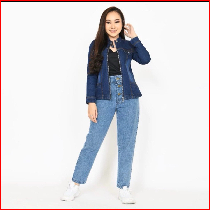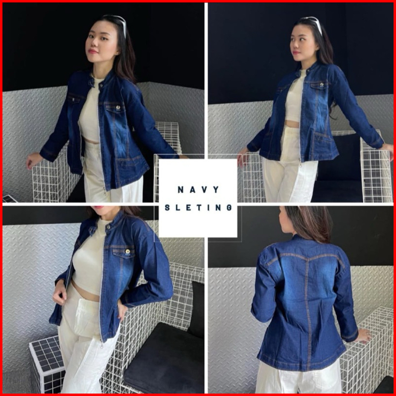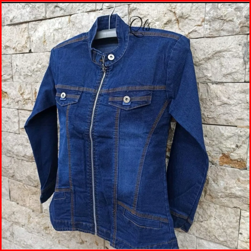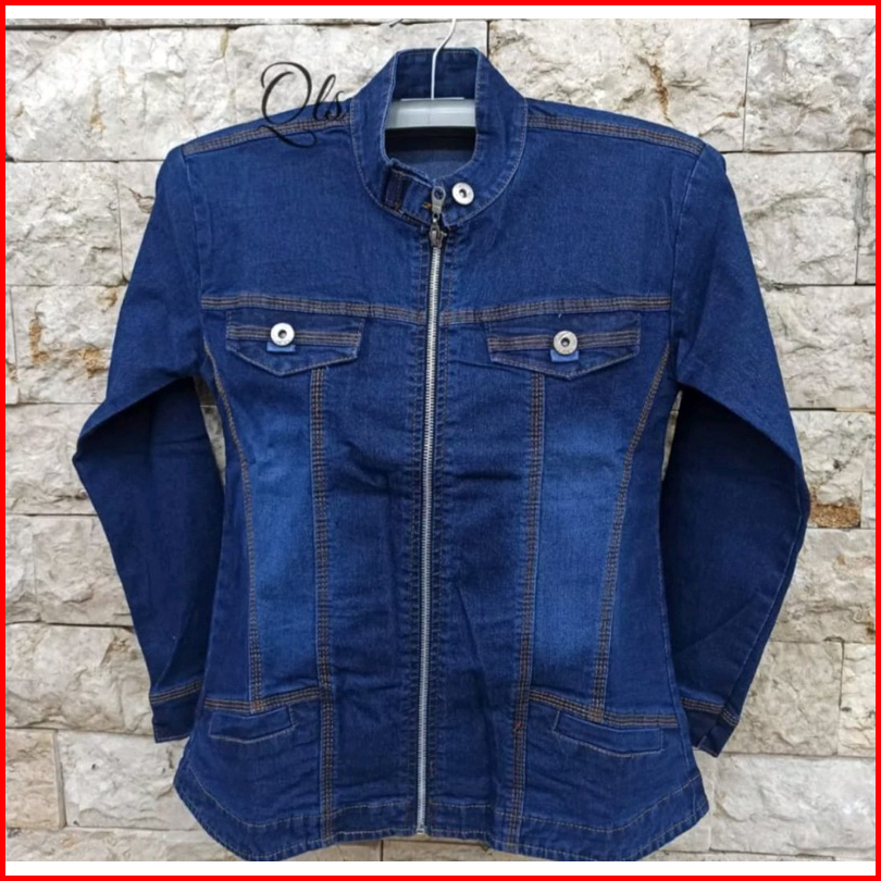 Jaket Jeans Sleting Wanita Model Kerah Sanghai Kancing Leher Denim