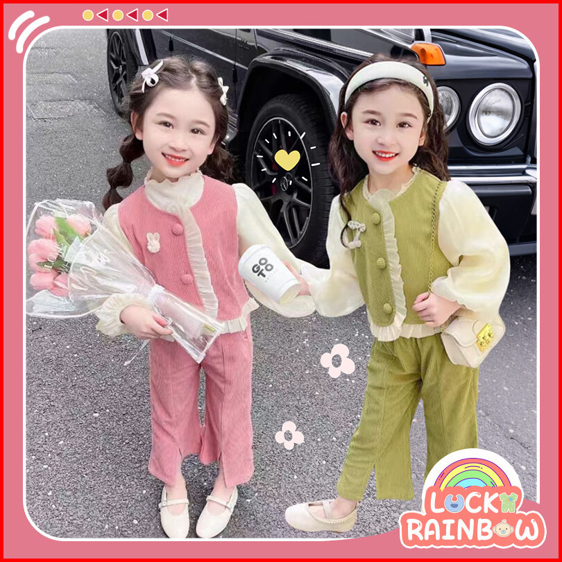 4 - 5 Tahun Setelan Anak Perempuan Setelan Baju Anak Perempuan Baju Atasan Rompi Corduroy Kancing Aktif Celana Corduroy