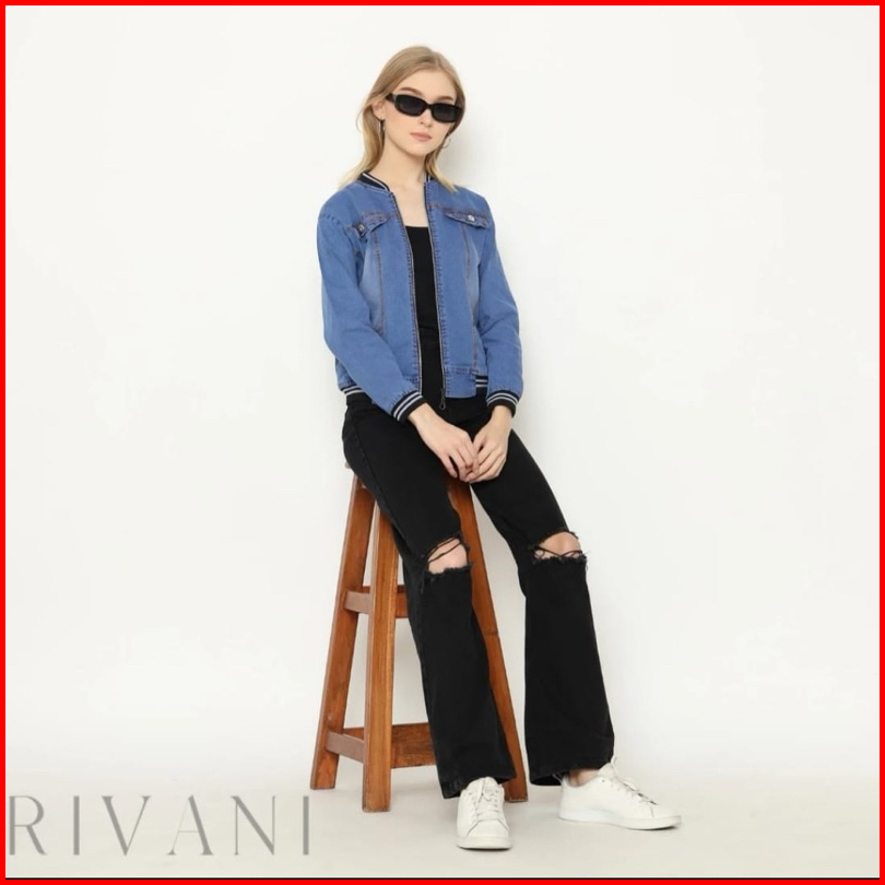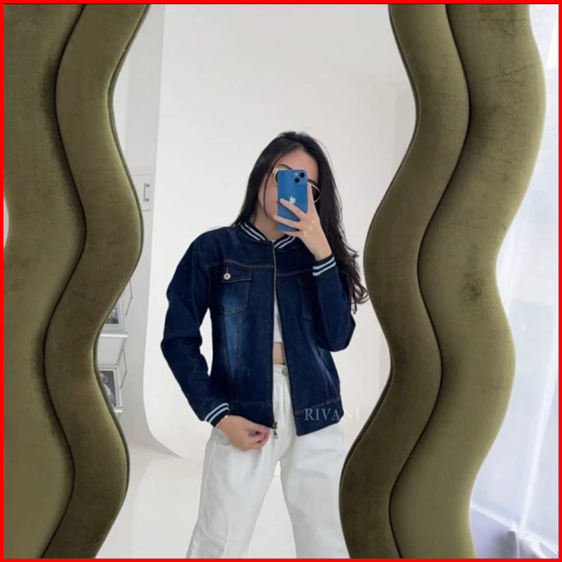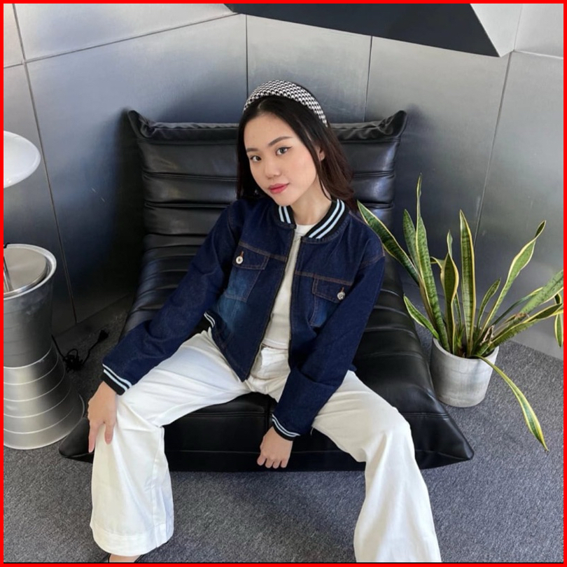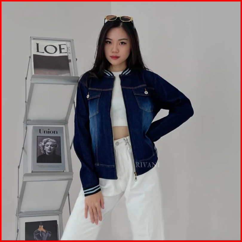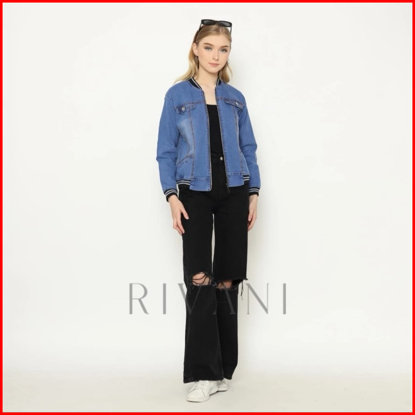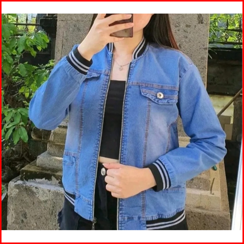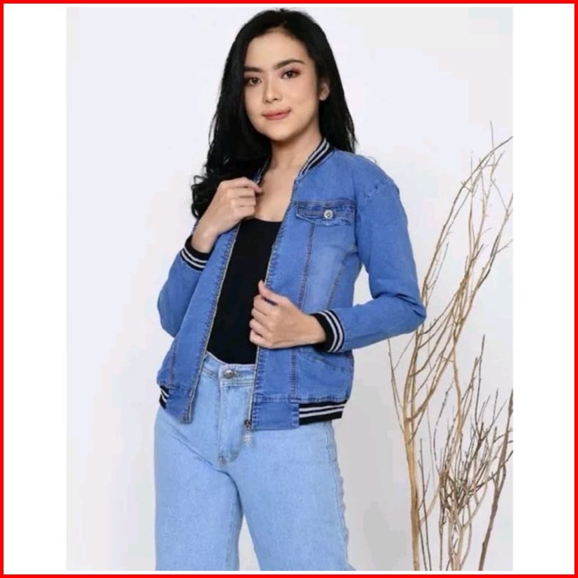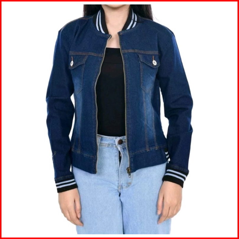 Jaket Jeans Bomber Cewek Denim Melar Wanita Strech Biru Navy Resleting
