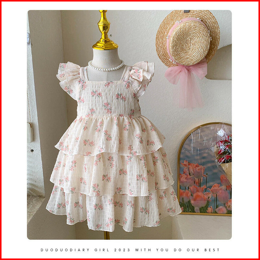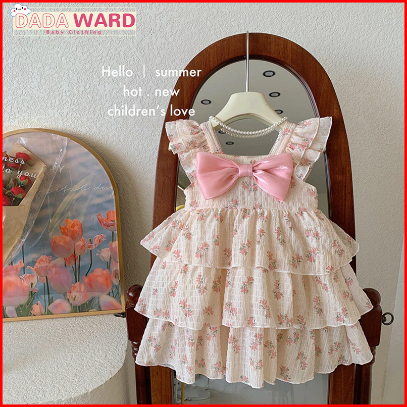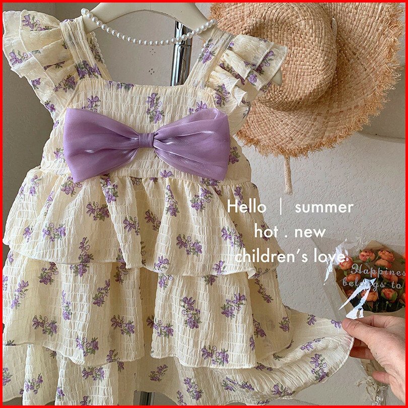 Gaun Rompi Bunga Usia 2-6 Tahun Anak Perempuan Gaya Korea Rok Kue Gaya Musim Panas Baru Gaun Bunga Busur Manis Dan Segar