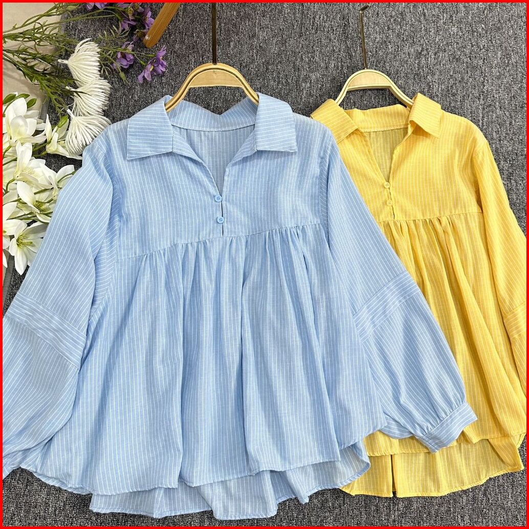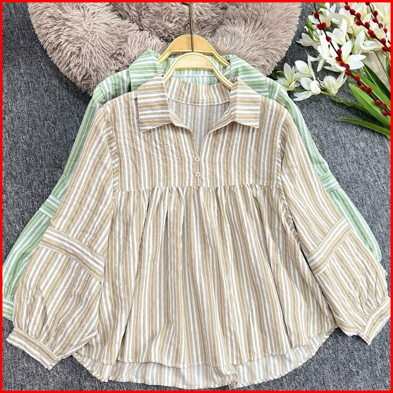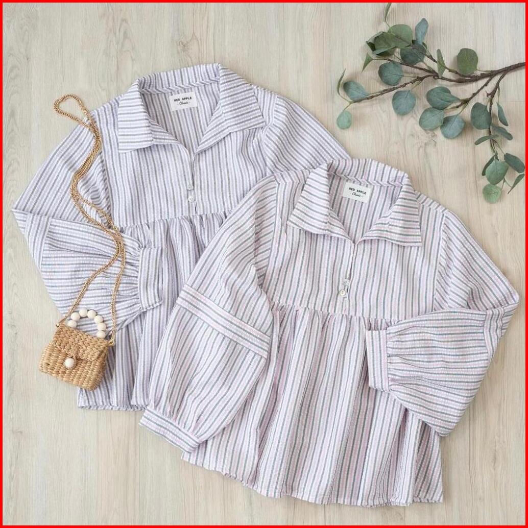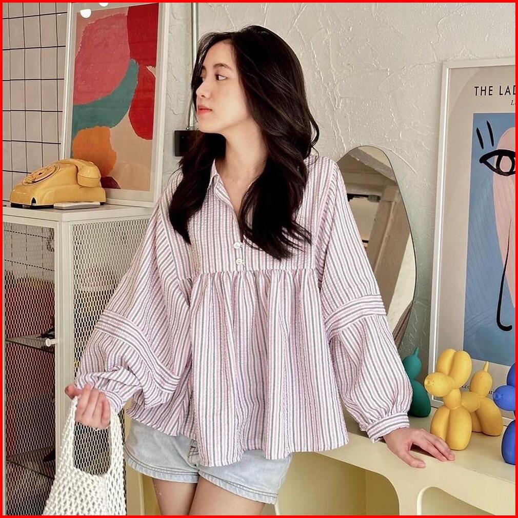 Kemeja Salur Wanita Bahan Katun Ii Atasan Lengan Panjang