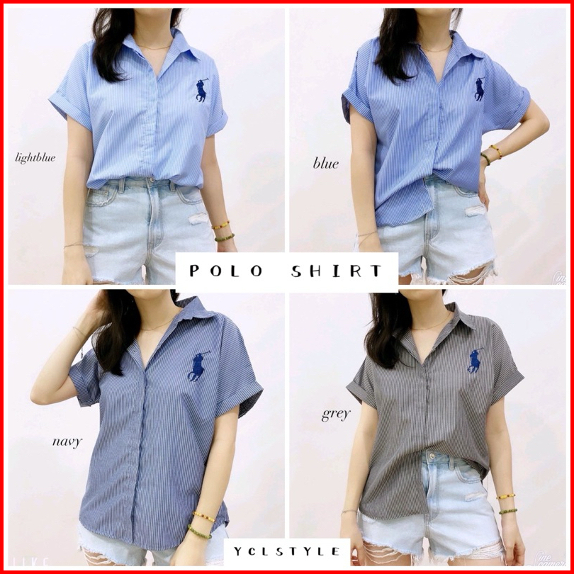 Basic Polo Bordir Stripes Shirt - Kemeja Salur Lengan Pendek Wanita Kasual Premium