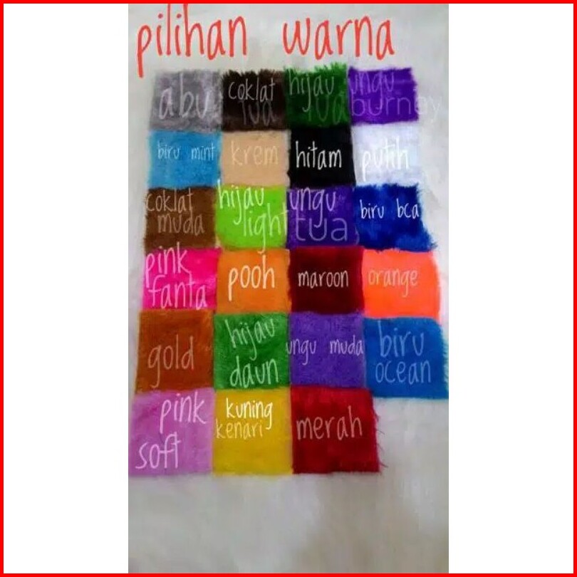 Hitam, Merah, Kuning, Hijau Muda, Hijau Tua, Biru Tua, Biru Muda, Abu, Pink soft, Pink fanta, Oranye, Cokelat Tua, Cokelat Muda, Ungu muda, Ungu Tua