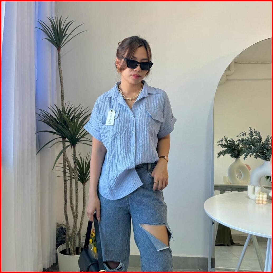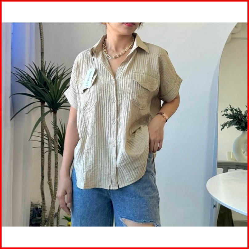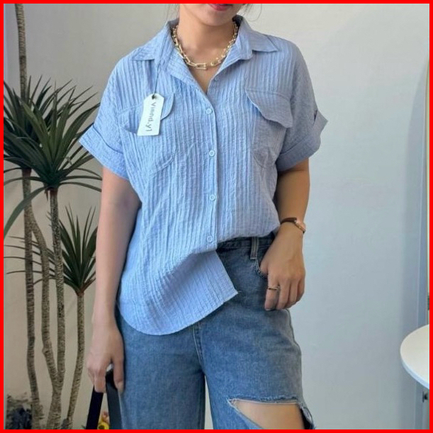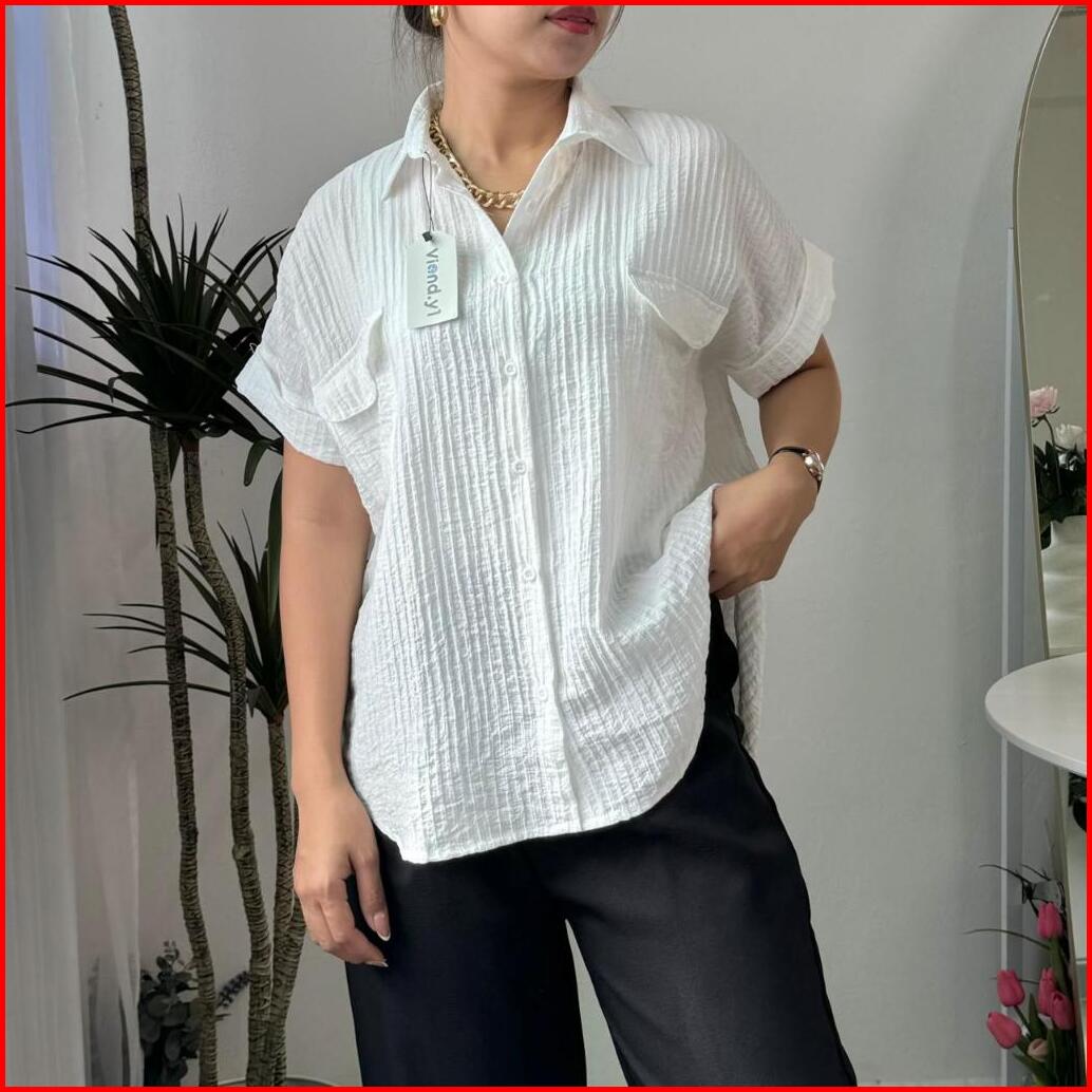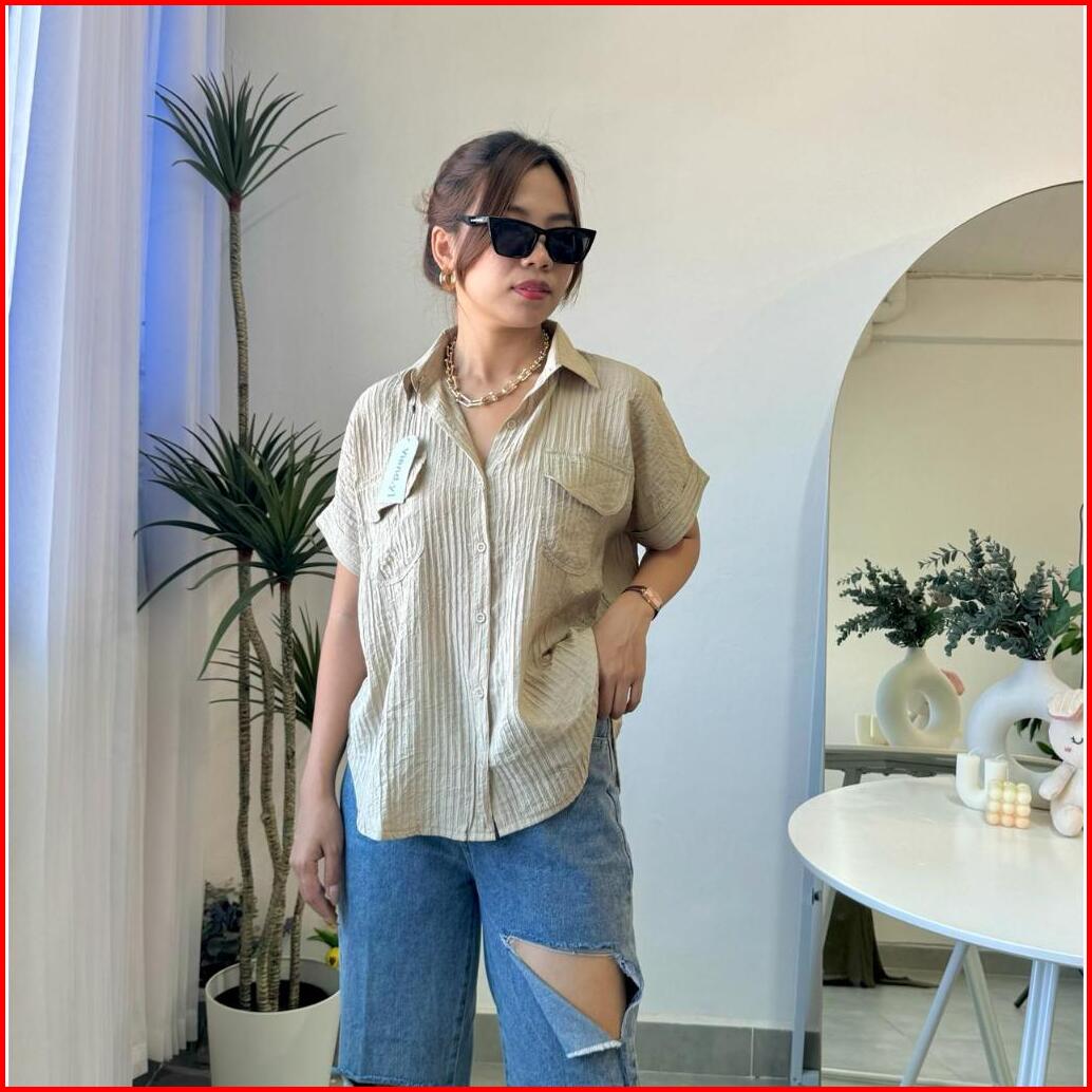 Shirt Top Atasan Wanita Korea Blouse Lengan Pendek Baju Pocket E.105