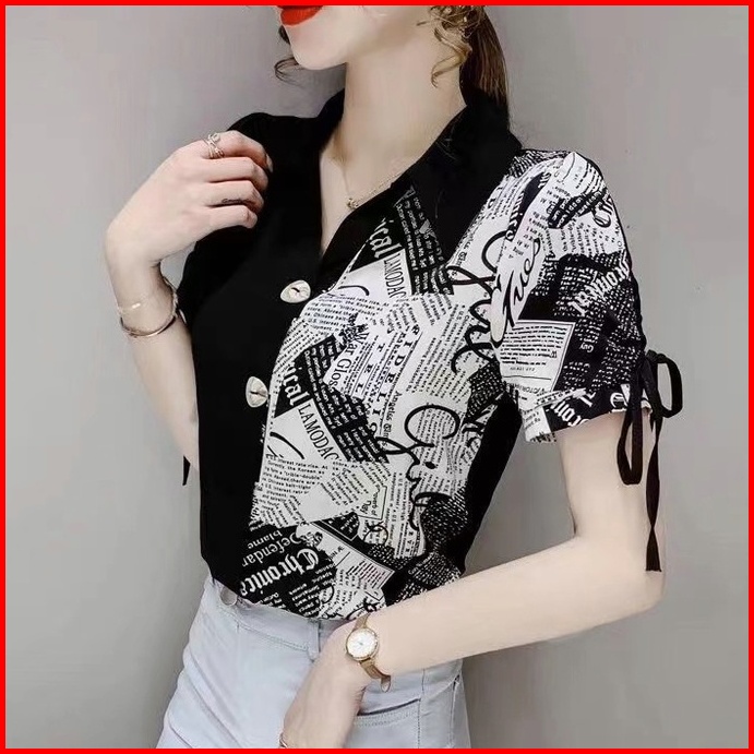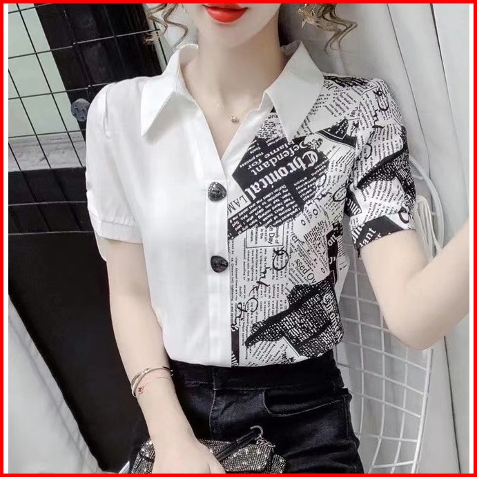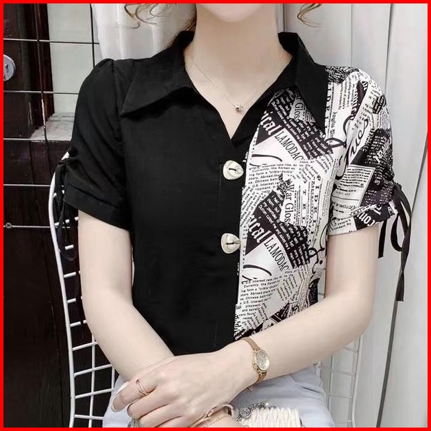 Baru Lengan Pendek Desain Asimetris Rasa Pengembangan Diri Temperamen Atasan Gaya Barat Penyambungan Warna Kontras Kemej