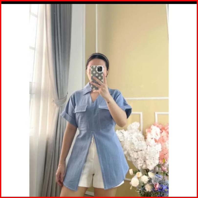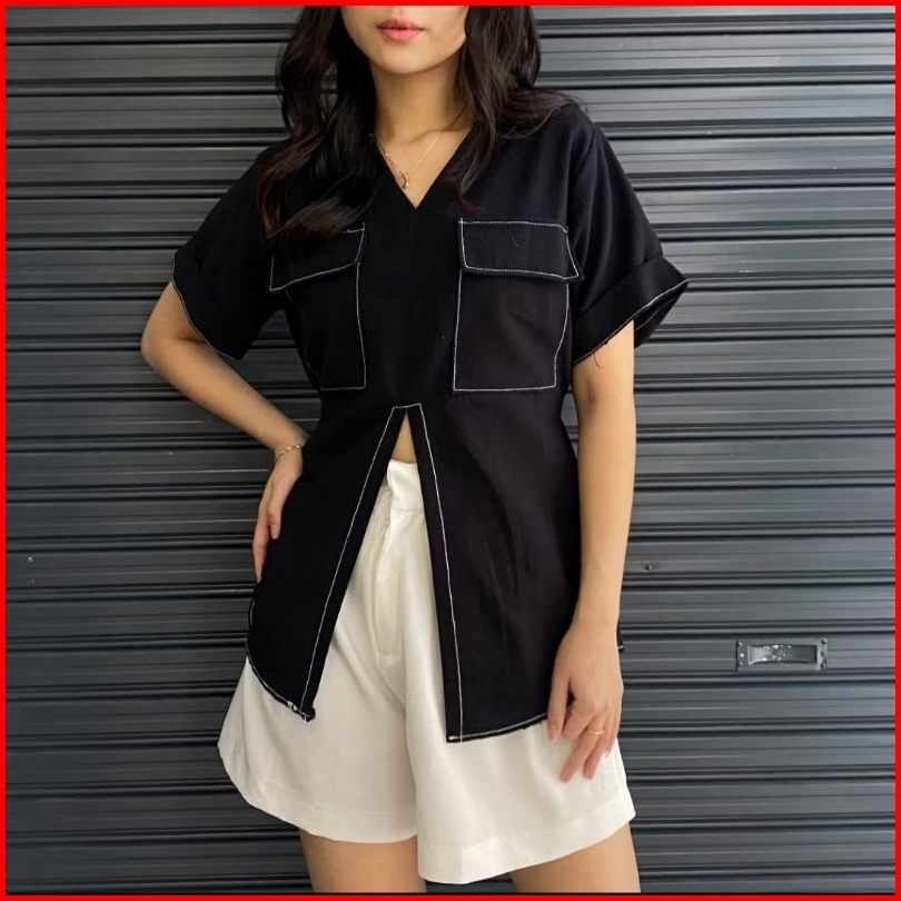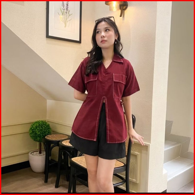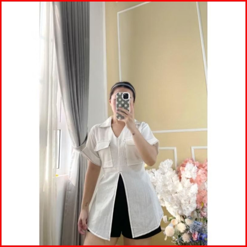 Lokta Pocket Slitshrit Bigsize Atasan Kemeja Wanital Line Tali Pinggang Terbaru Linen