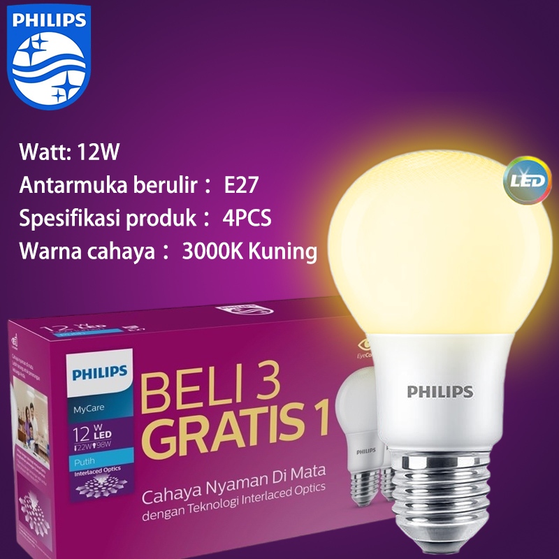 【PAKET ISI 4 LAMPU】Philips Lampu LED 12W E27 3000K Kuning, Penghematan energi, perlindungan mata READY STOCK