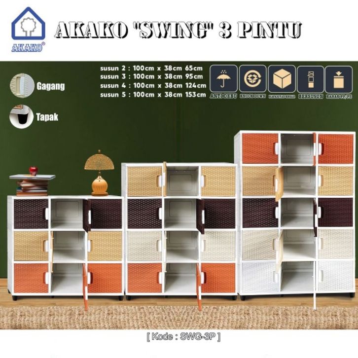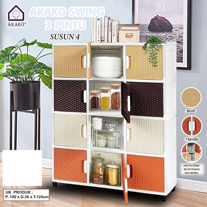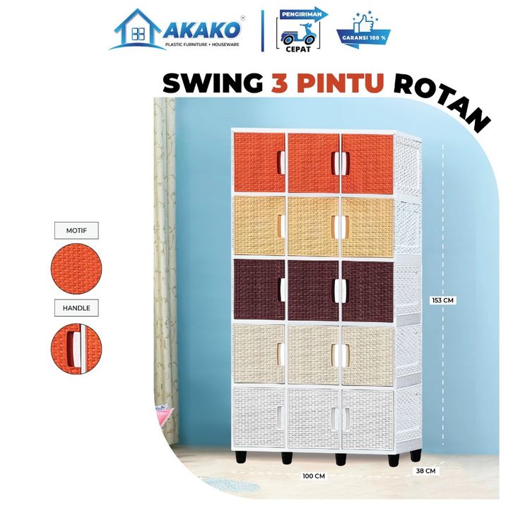 Lemari Plastik Pakaian AKAKO Lemari SWING 3 Pintu Motif Rotan Warna Full Color (Kode = S3P)