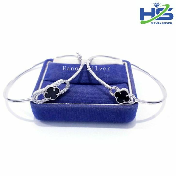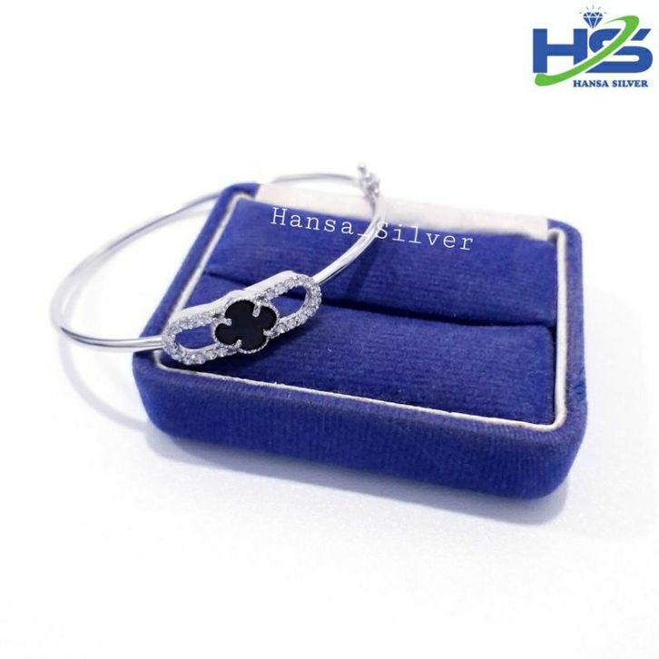 Gelang Perak Asli Silver 925 Lapis Ems Putih Motif Bangle Bunga Hitam - Gelang Anti Karat