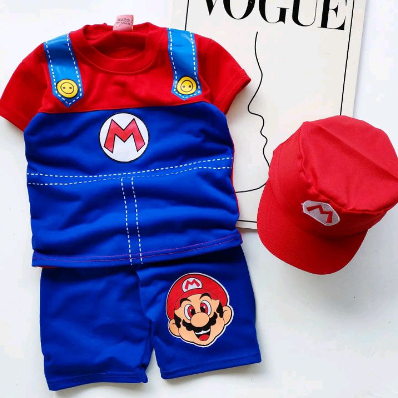 baju setelan anak mario kostum mariobross ada topi untuk umur 1-10tahun