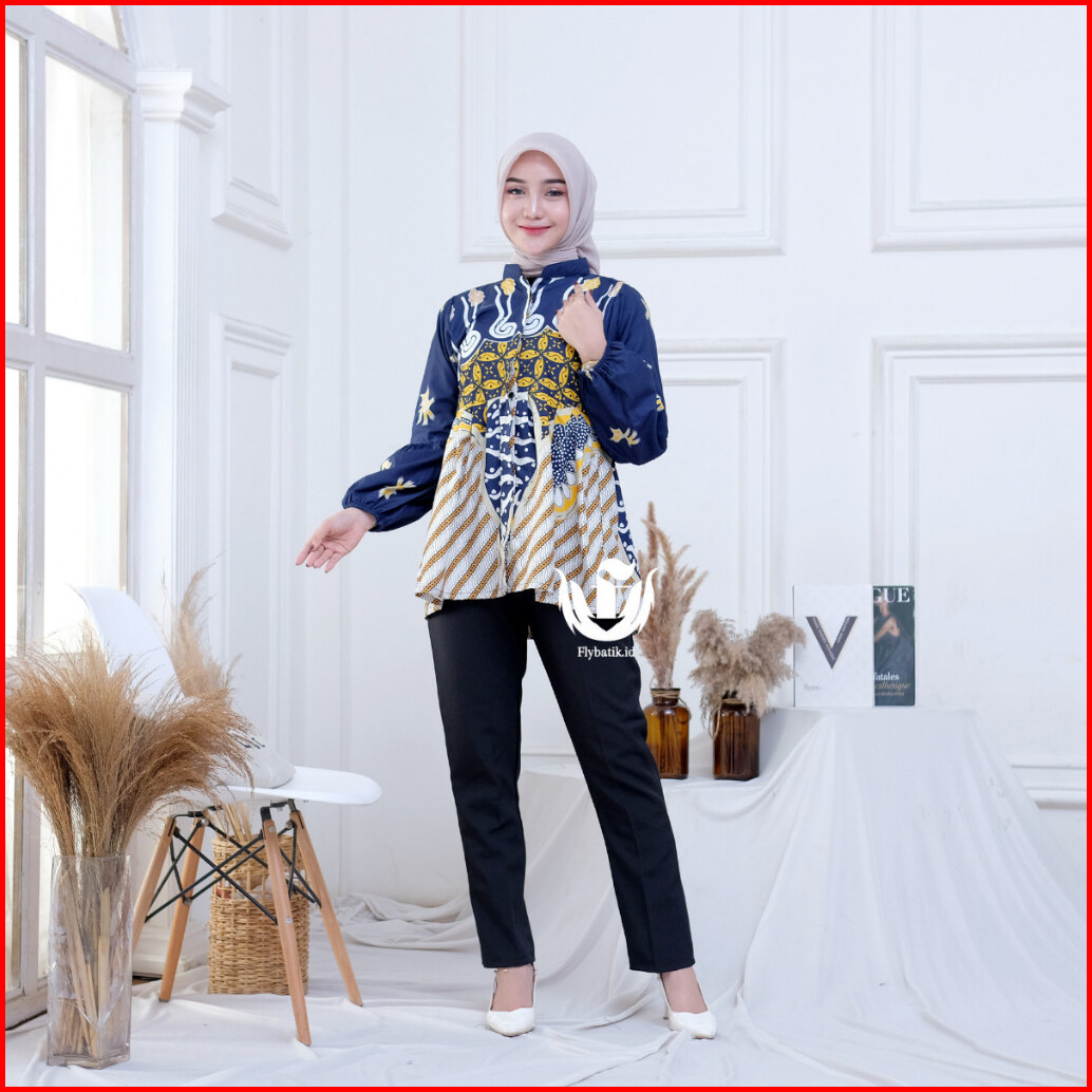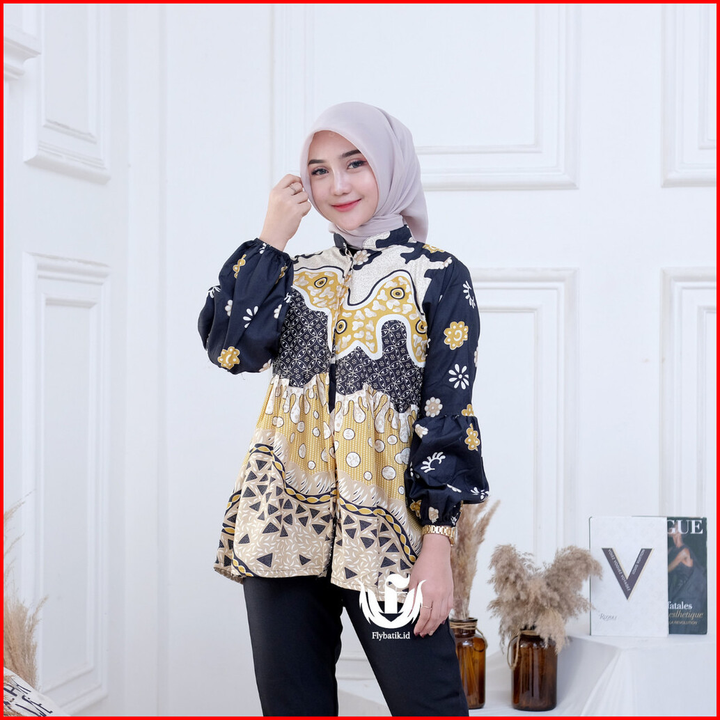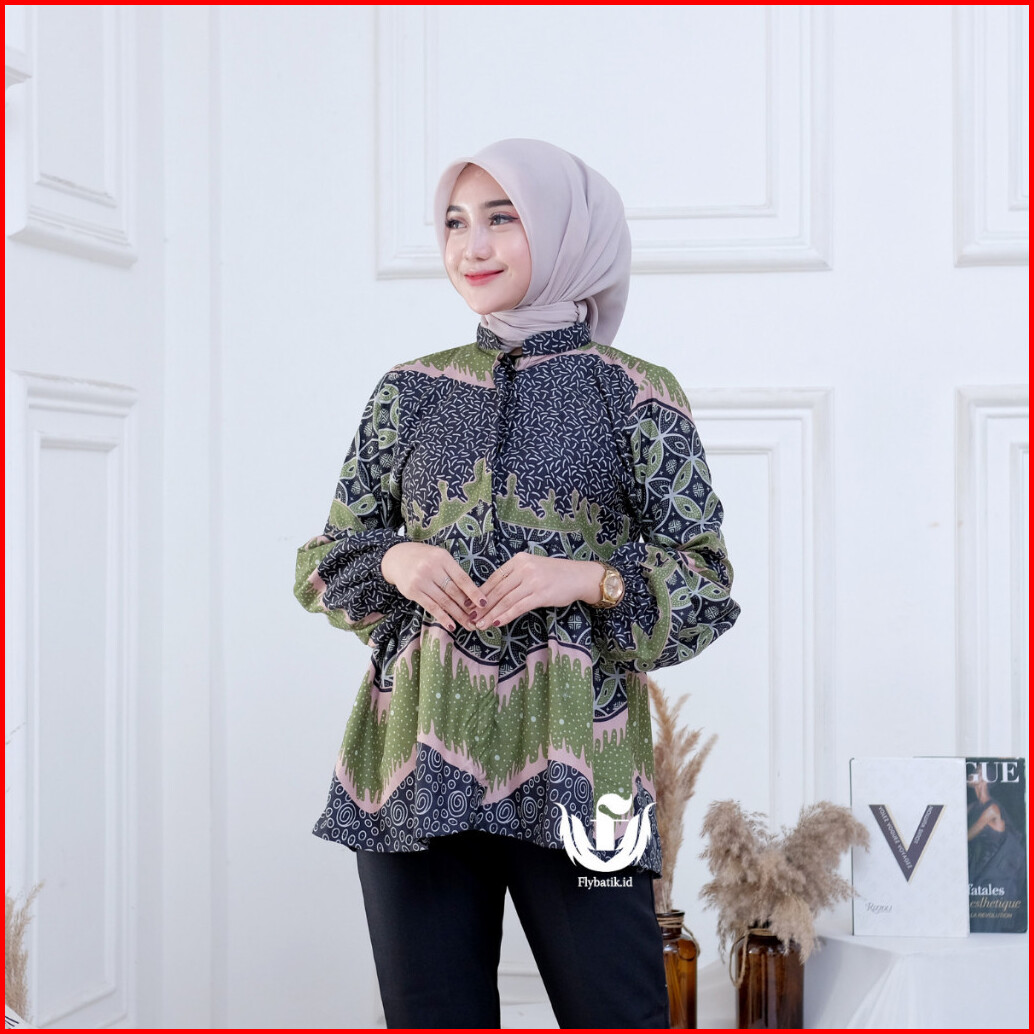 Flybatik.id Atasan Baju Blouse Batik Wanita Jumbo Modern Kerja Lengan Balon M L Xl Xxl