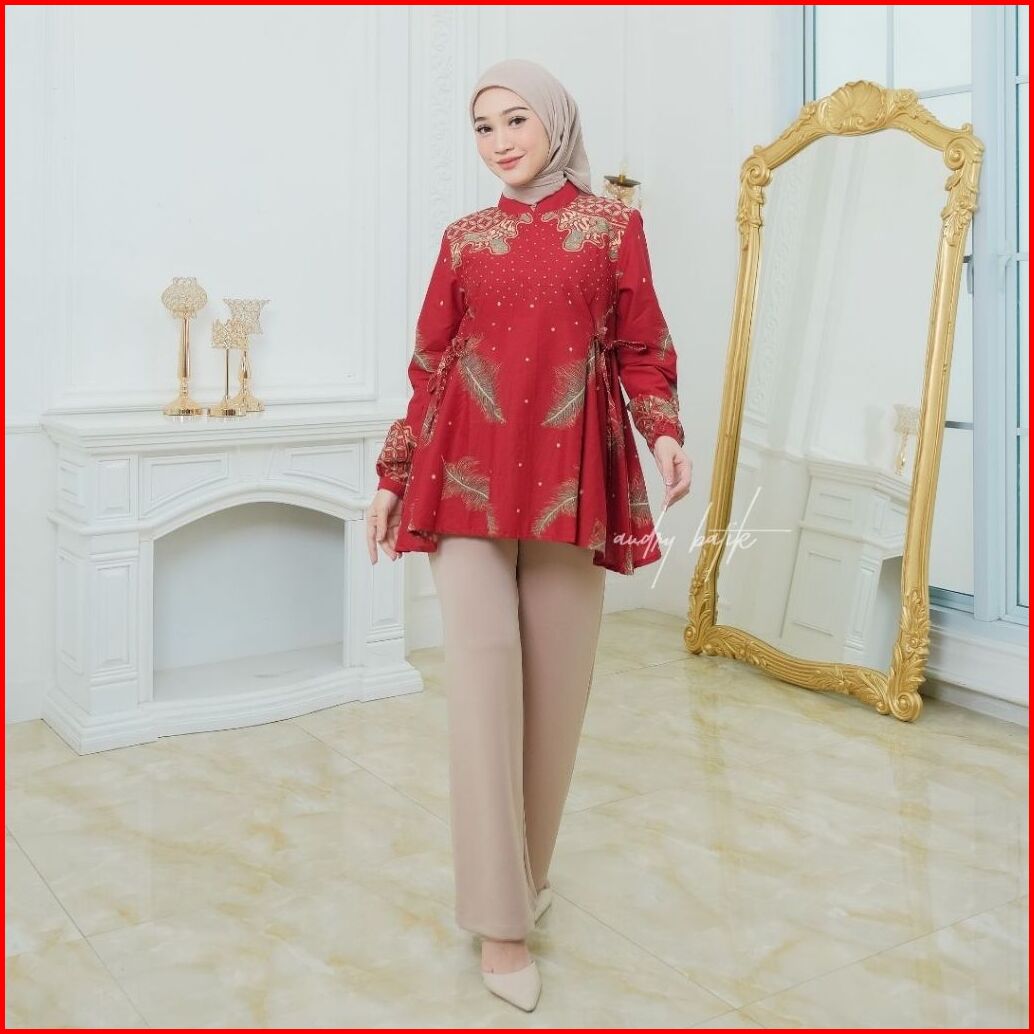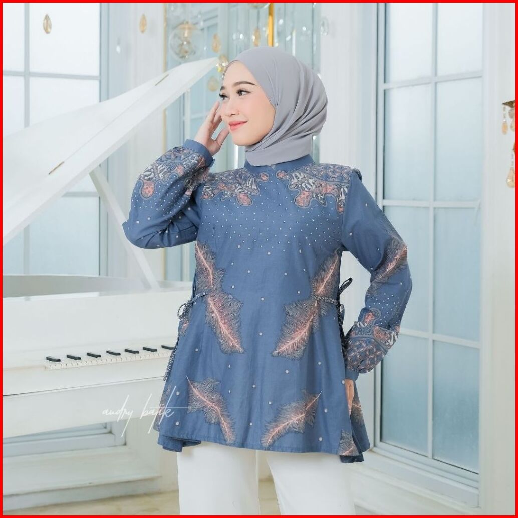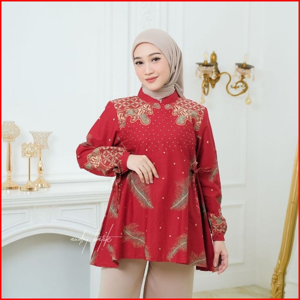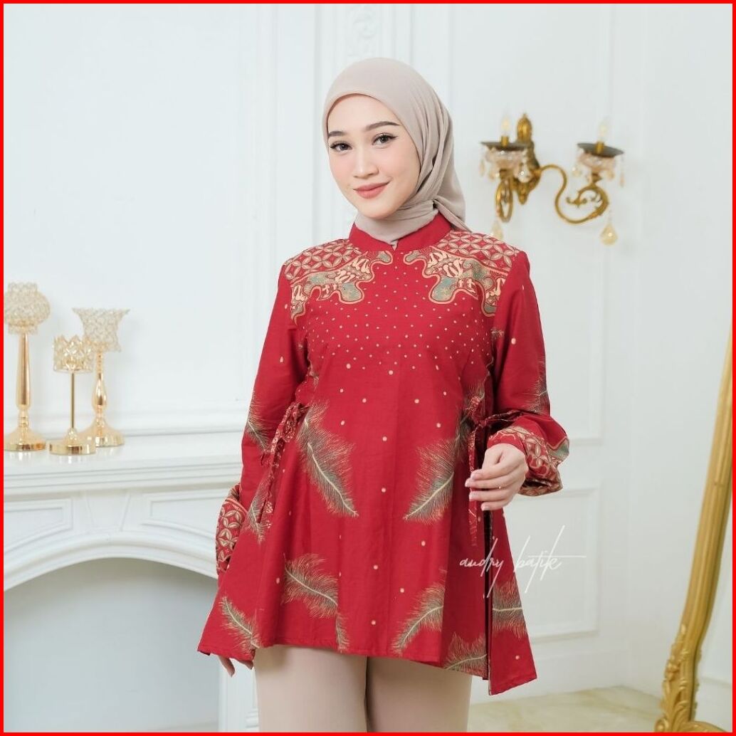 Audry Batik - Renata 2 - Blouse Batik Kerja Wanita Panjang Hijab Modern Motif Kawung Biru Merah