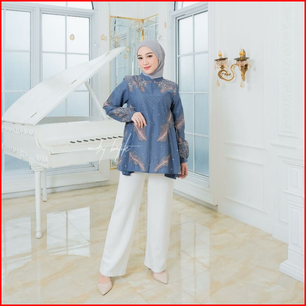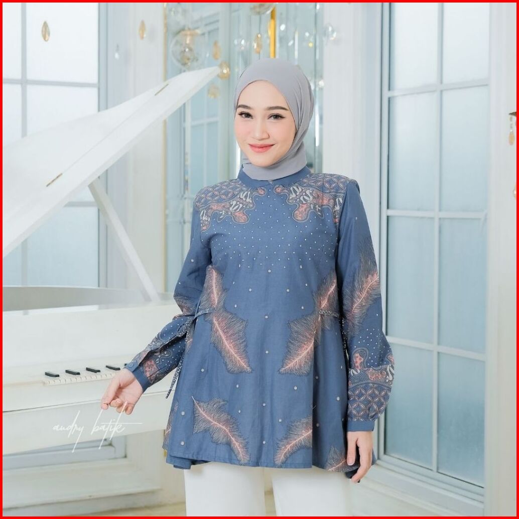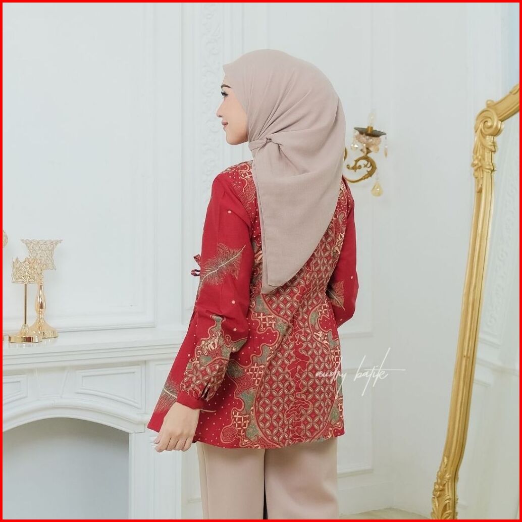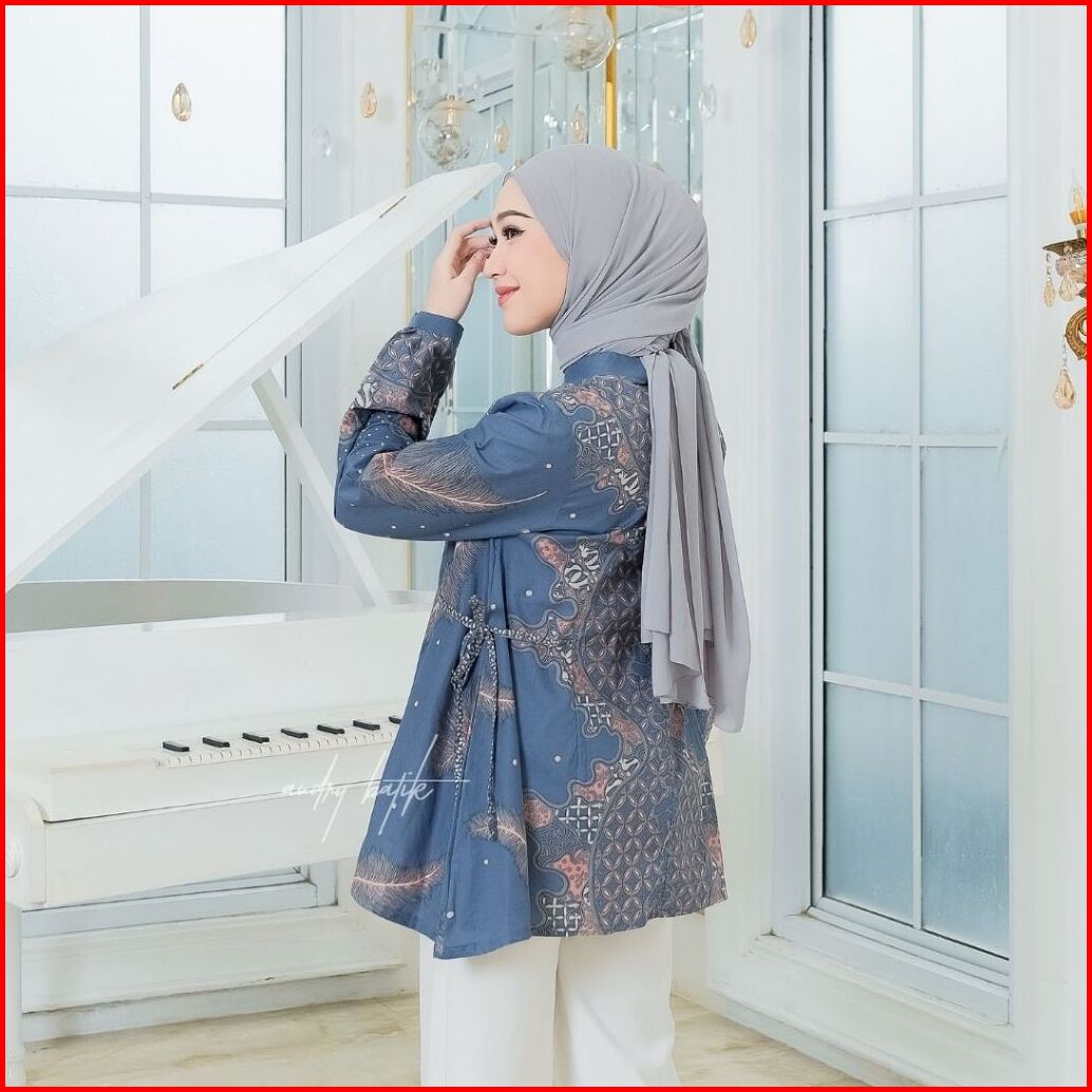 Audry Batik - Renata 2 - Blouse Batik Kerja Wanita Panjang Hijab Modern Motif Kawung Biru Merah