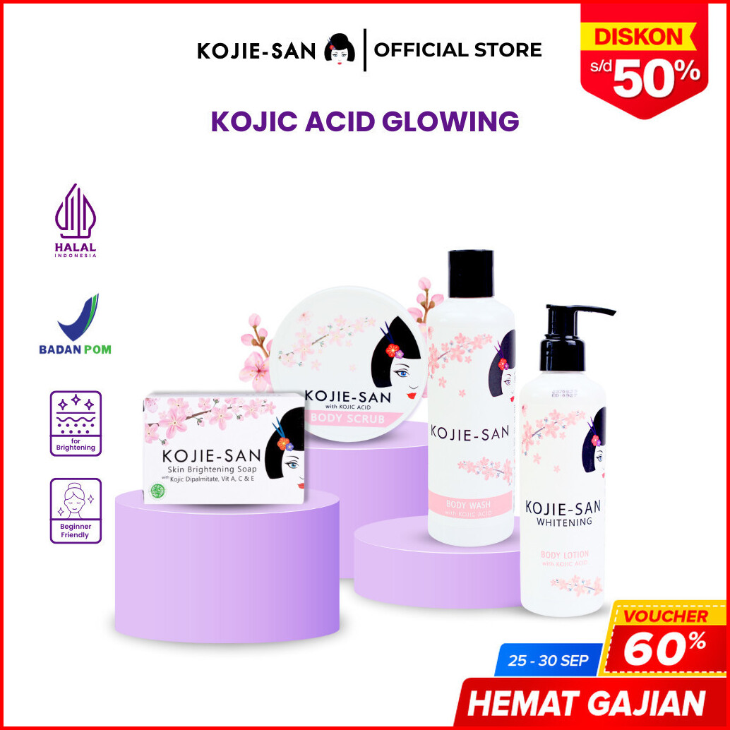 Kojie-san Paket Kojic Glowing Body Lotion Body Wash Body Scrub 250gr Soap 65gr Moisturizing