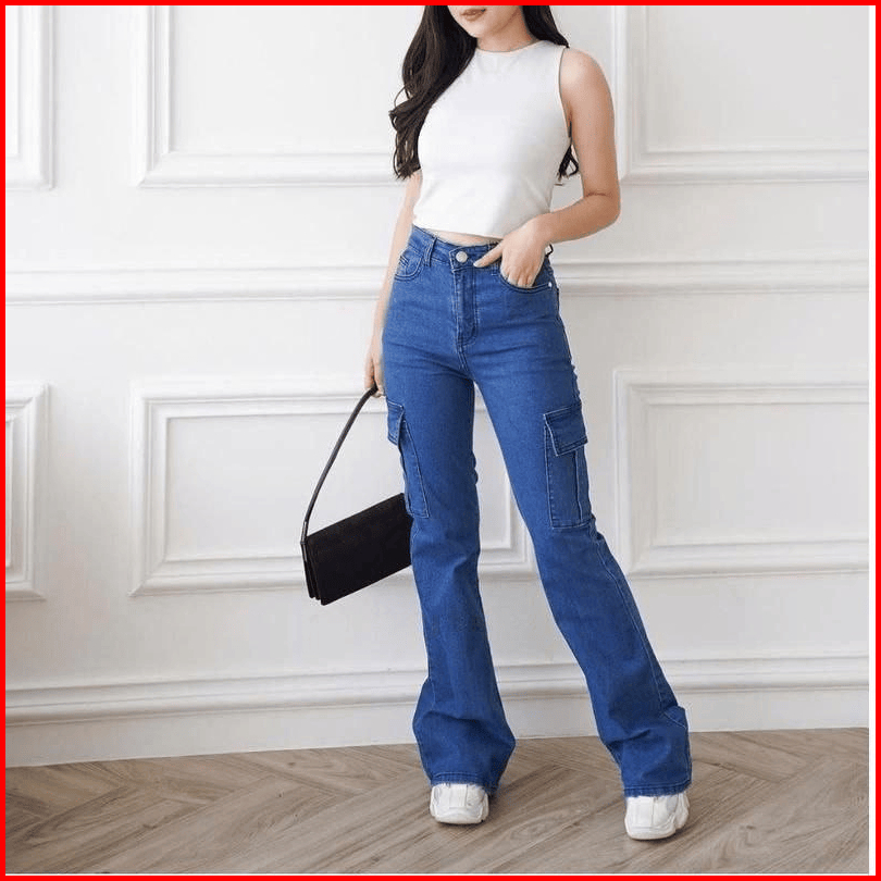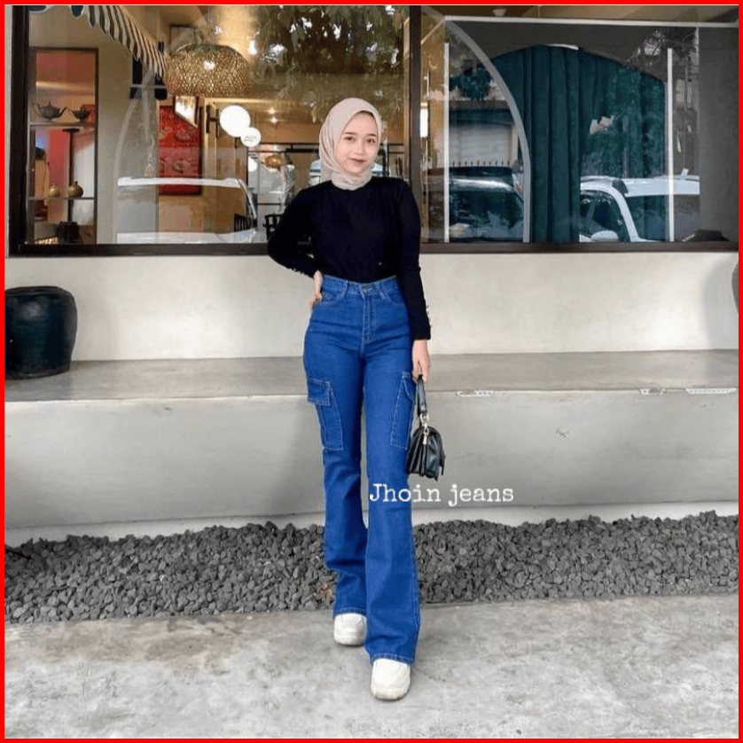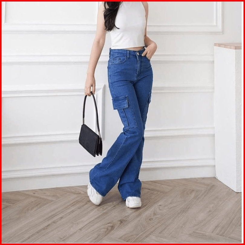 Jhoin Fashion - Celana Jeans Wanita Cargo Cutbray Highwaist Stretch Melar