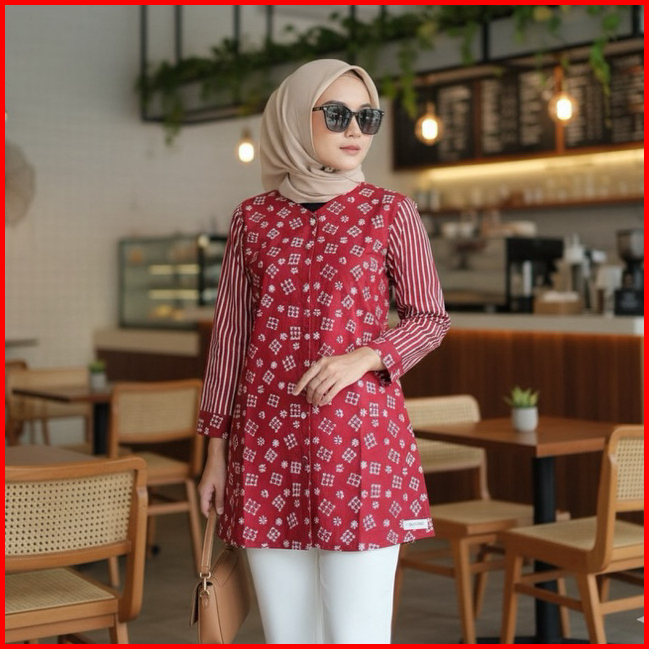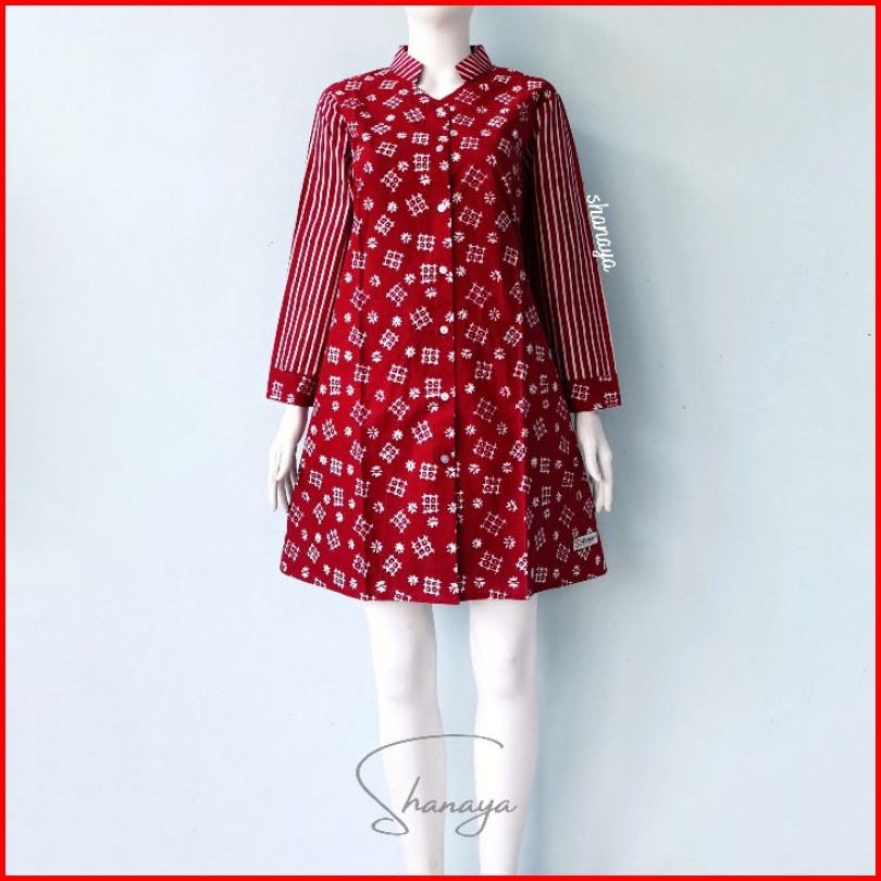 Shanaya Baju Batik Wanita Tunik Marun Cap Garutan Full Kancing Depan Lengan Panjang Batik Kerja Wanita Batik Resmi Canti