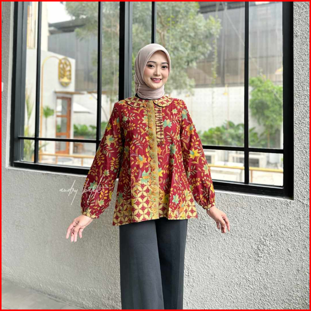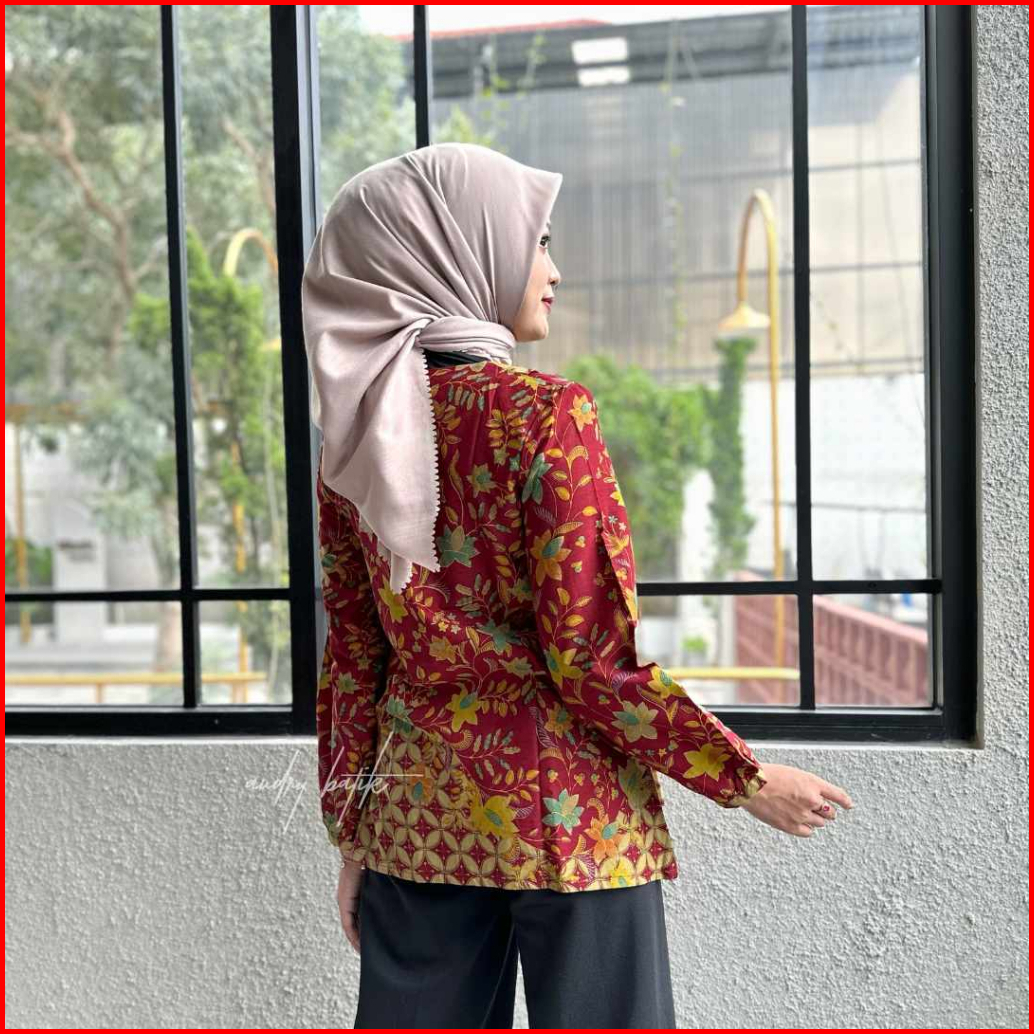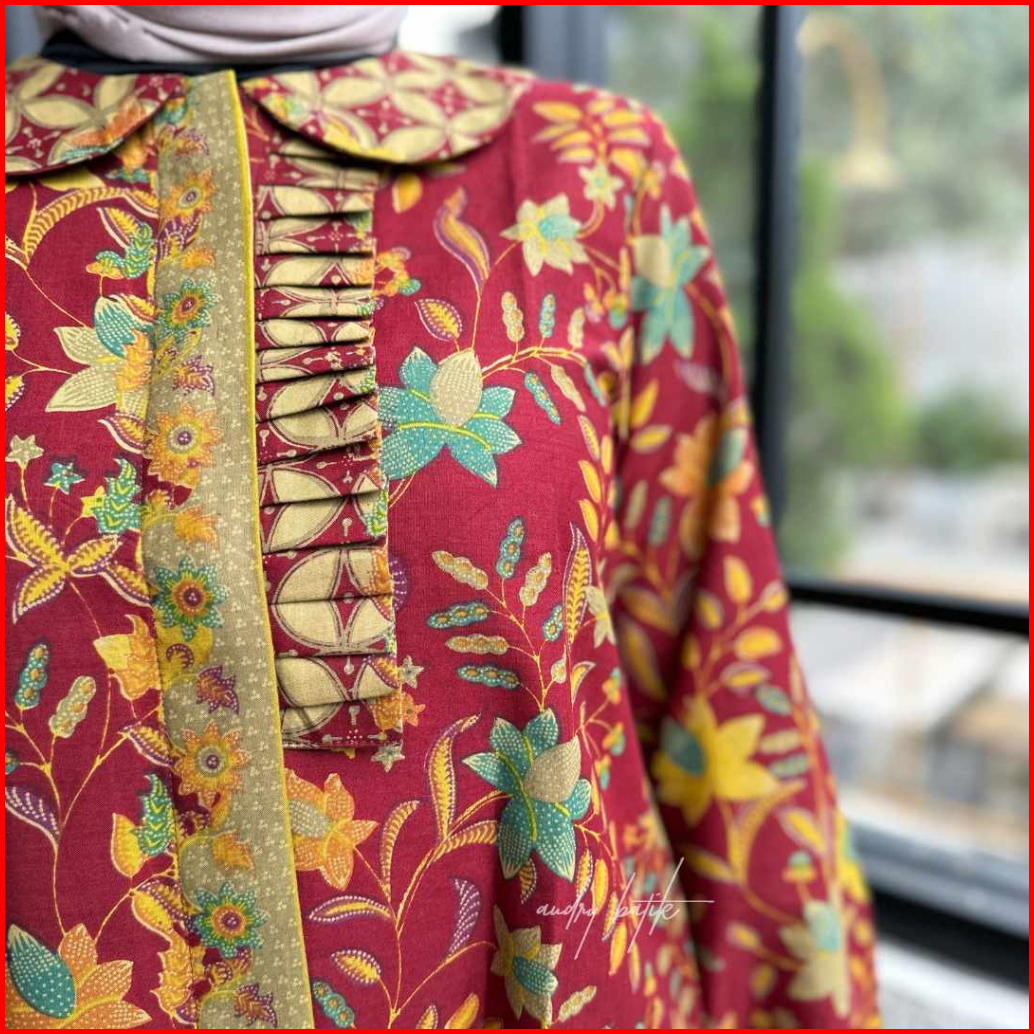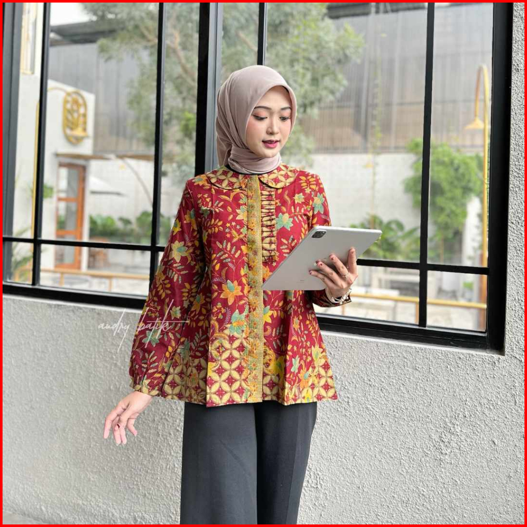 Audry Batik - Cindy - Blouse Batik Kerja Wanita Panjang Hijab Modern Motif Bunga Maroon Hijau