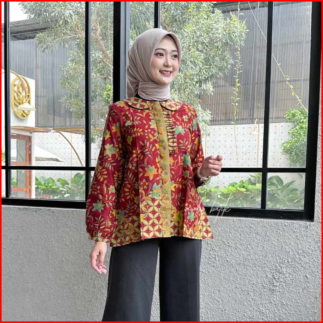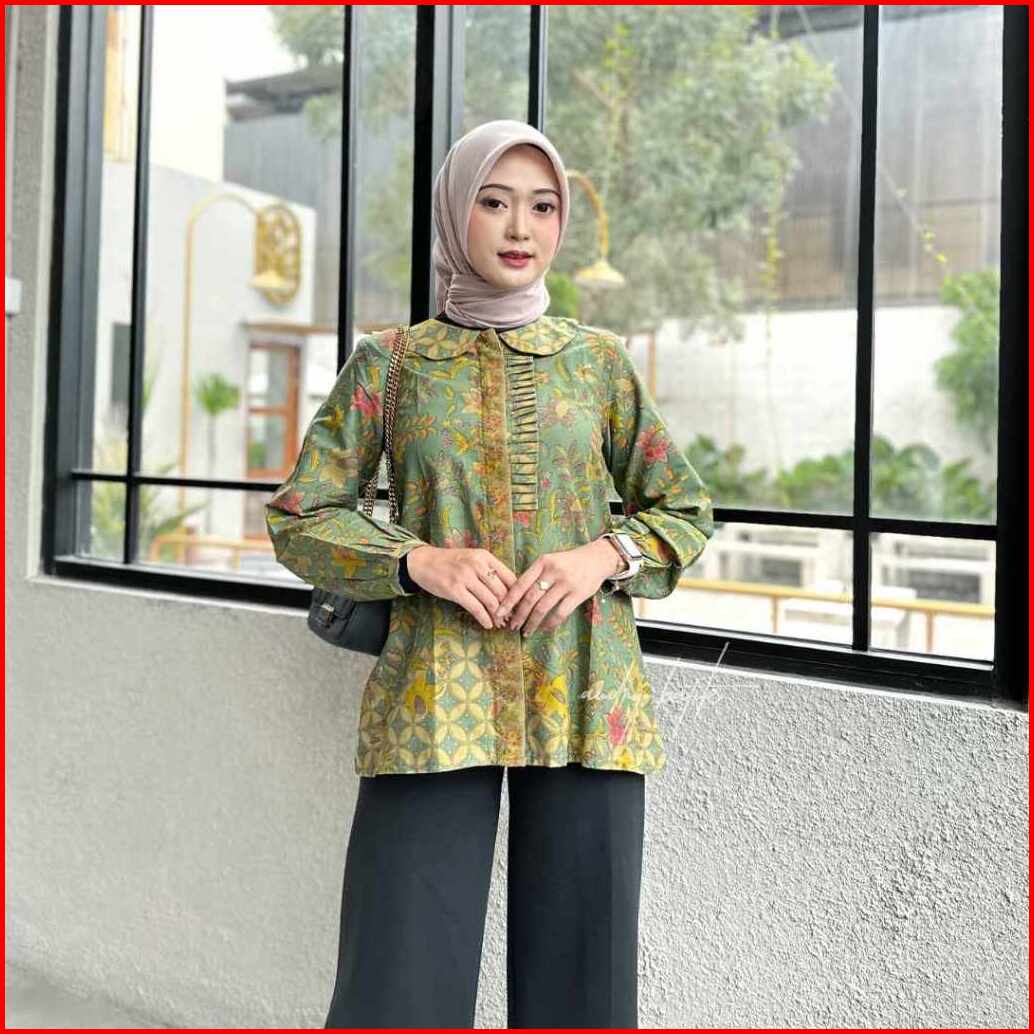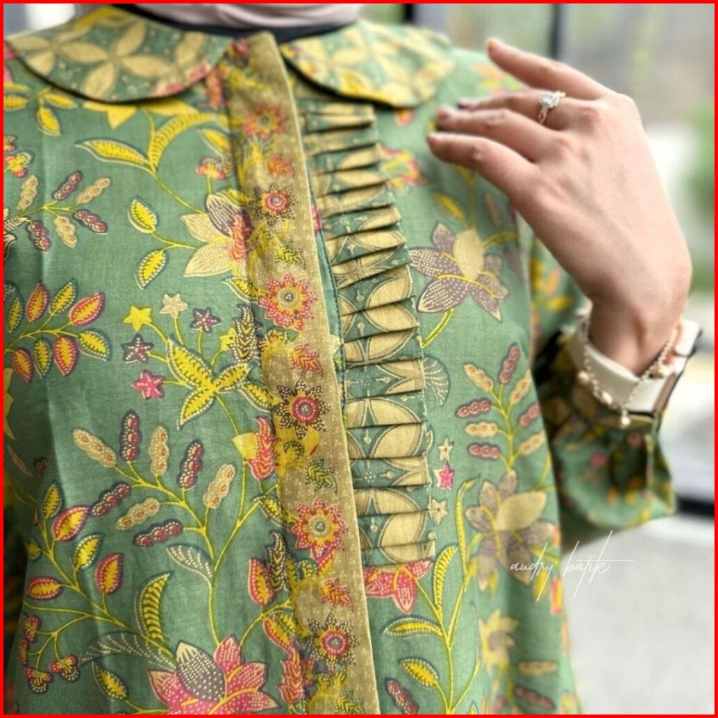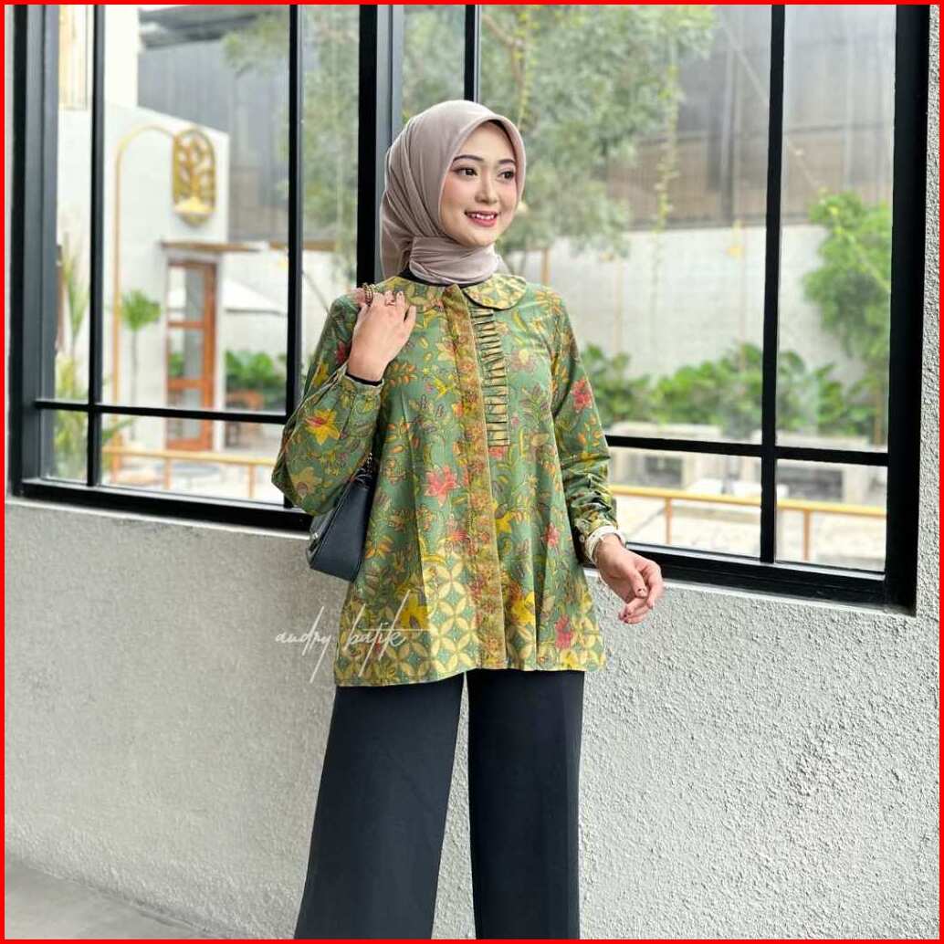 Audry Batik - Cindy - Blouse Batik Kerja Wanita Panjang Hijab Modern Motif Bunga Maroon Hijau
