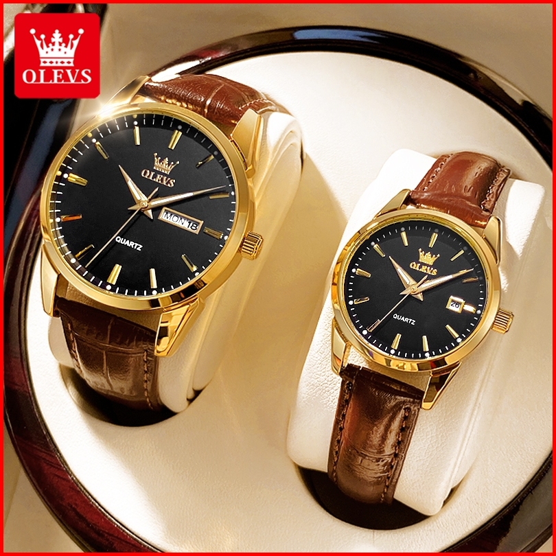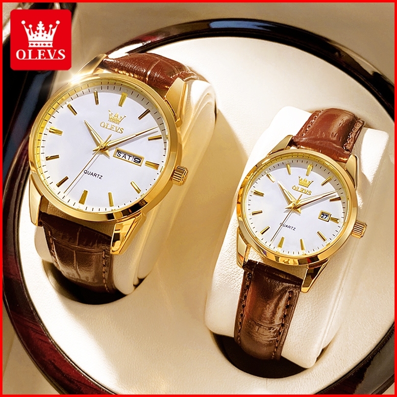 Olevs Jam Tangan Couple Pria Wanita Original Anti Air Analog Kulit Terbaru 2025 Tanggal Otomatis Kuarsa Bercahaya Couple