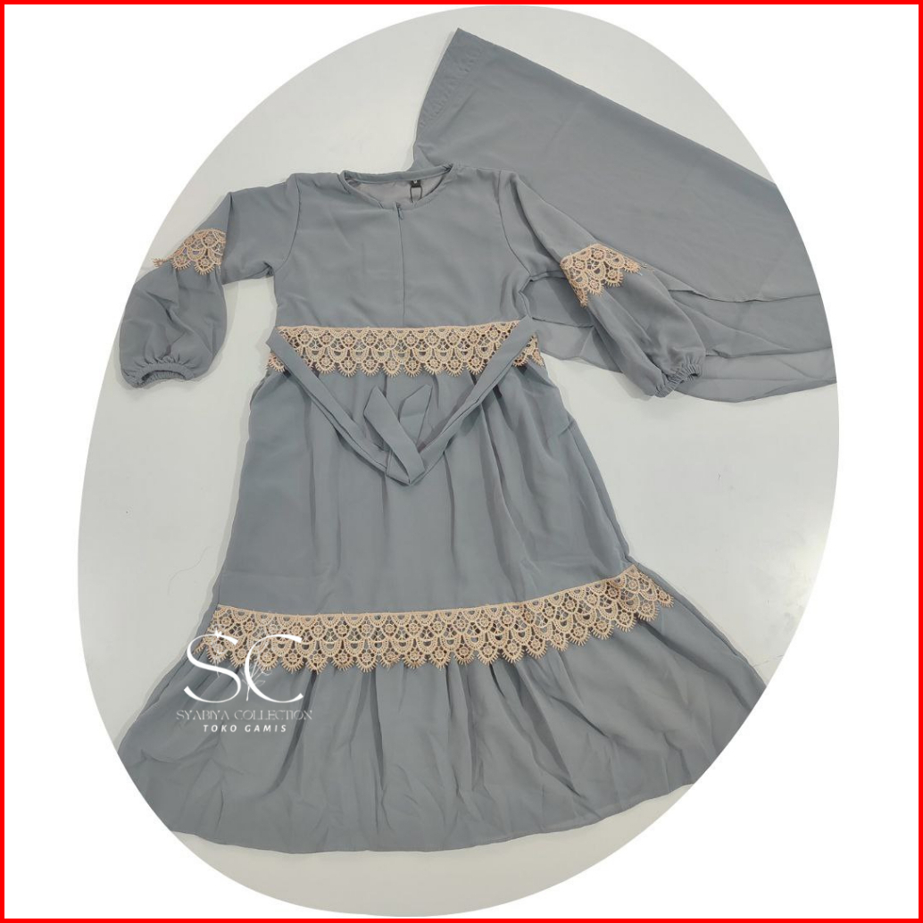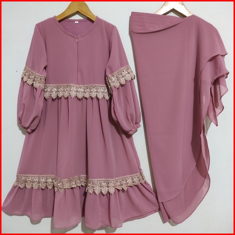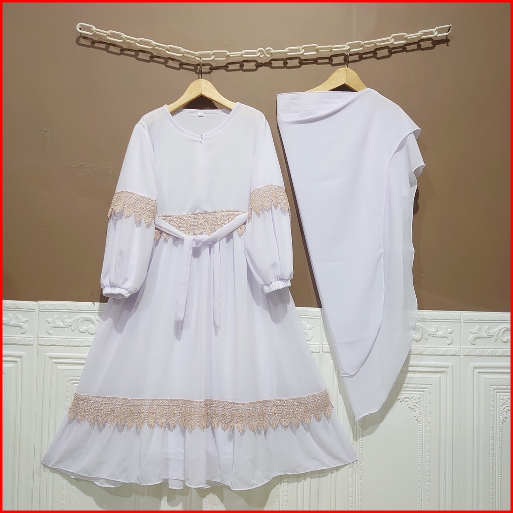 Gamis Ceruty Anak Hijab Putih Lembut Adem Nyaman Dipakai Set Hijab Renda 2-12 Tahun Full Puring