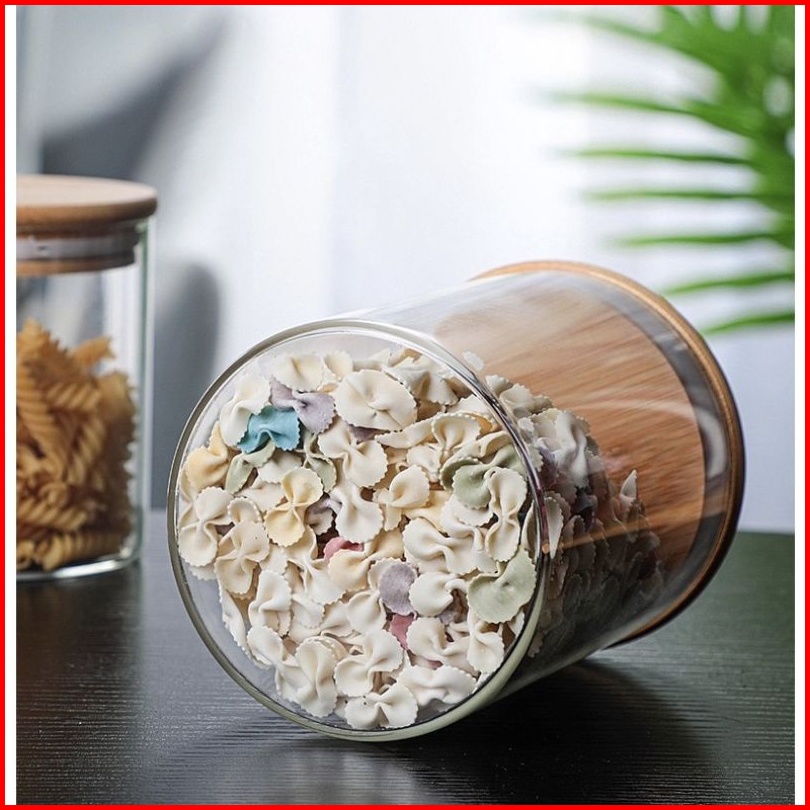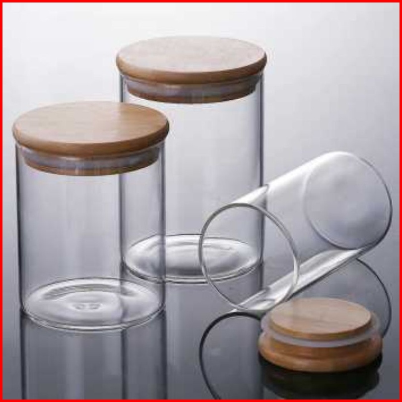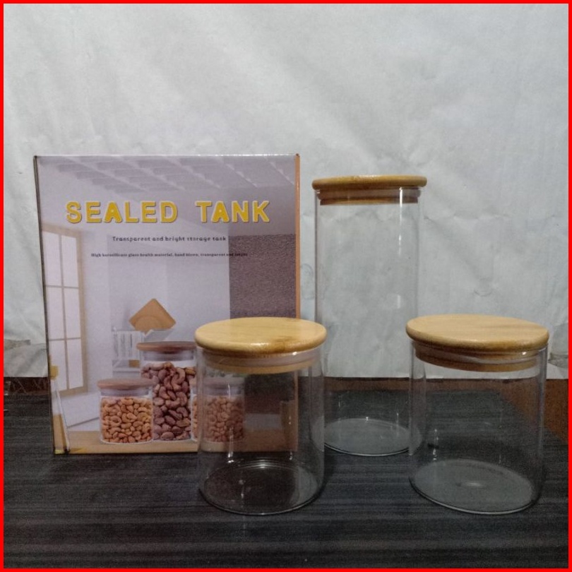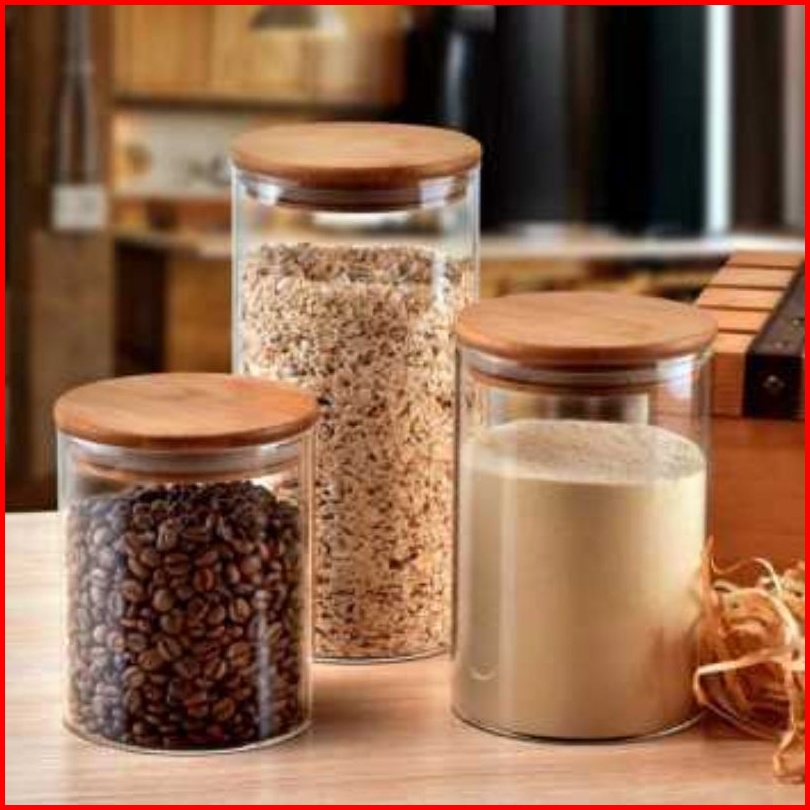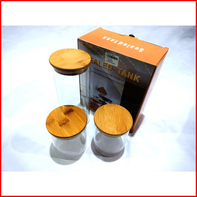 Toples Kaca Set 3 Tutup Kayu Tempat Makanan Tempat Permen Set 3