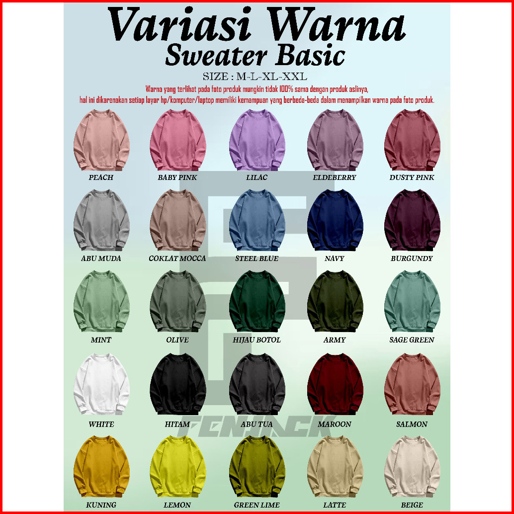 HITAM, PUTIH, BEIGE, SAGE GREEN, STEEL BLUE, ALDERBERRY, MINT, PEACH, OLIVE, ABU TUA, ABU MUDA, SALMON, DUSTY PINK, GREEN LIME, LEMON, MAROON, NAVY, LILAC, MOCCA, LATTE, BABY PINK, KUNING, ARMY, HIJAU BOTOL, RANDOM WARNA&DESIGN