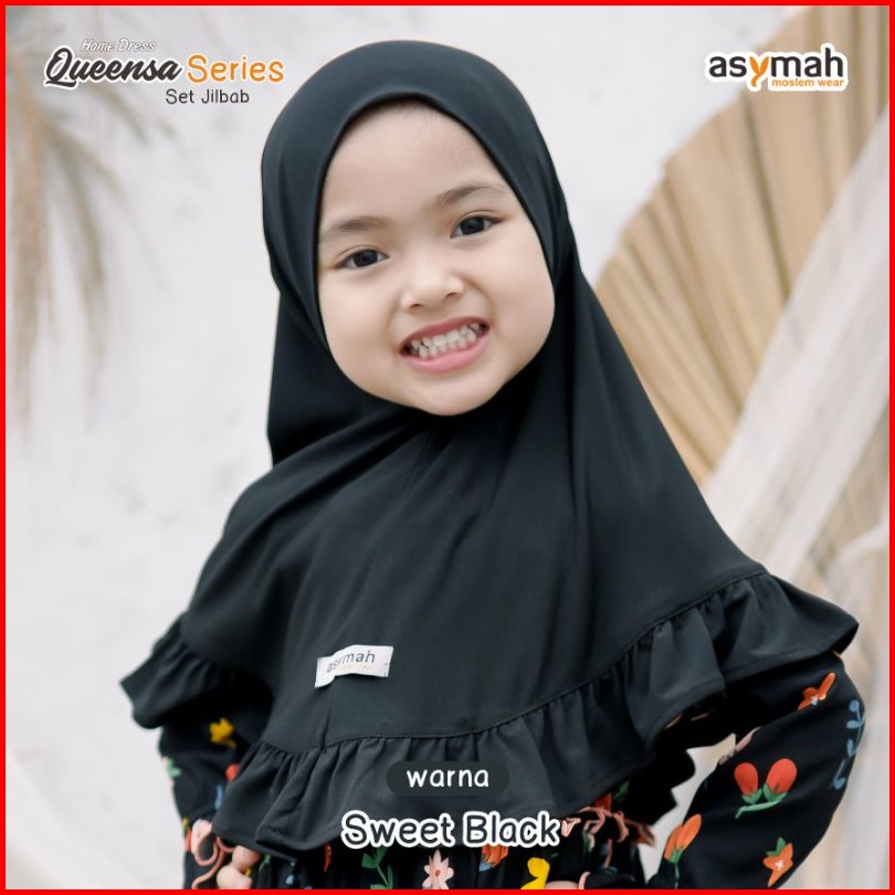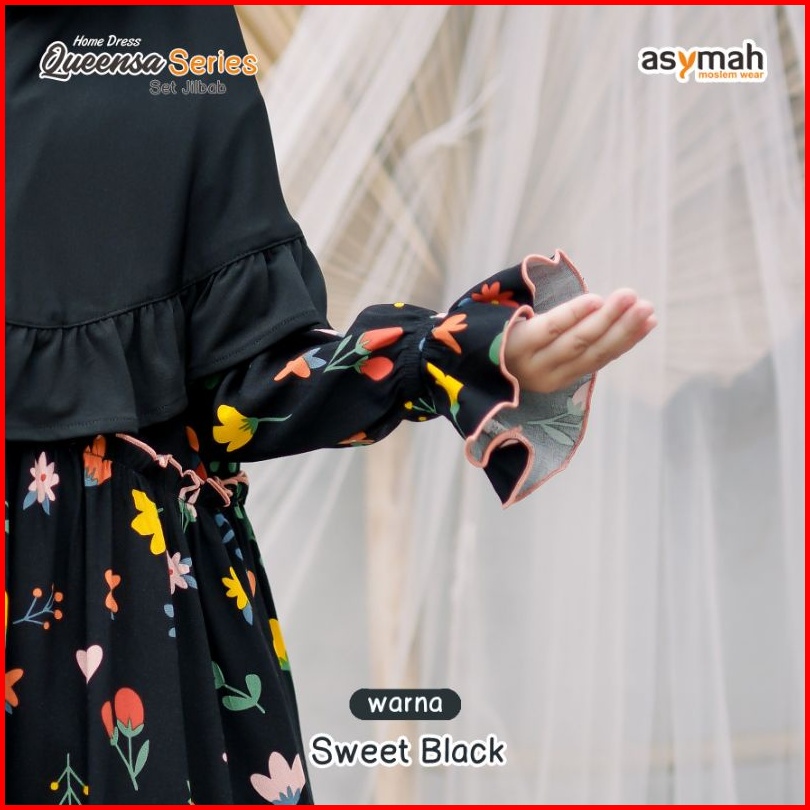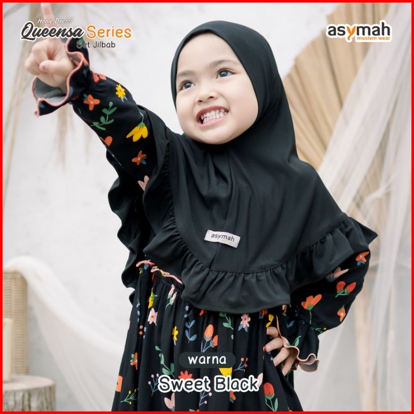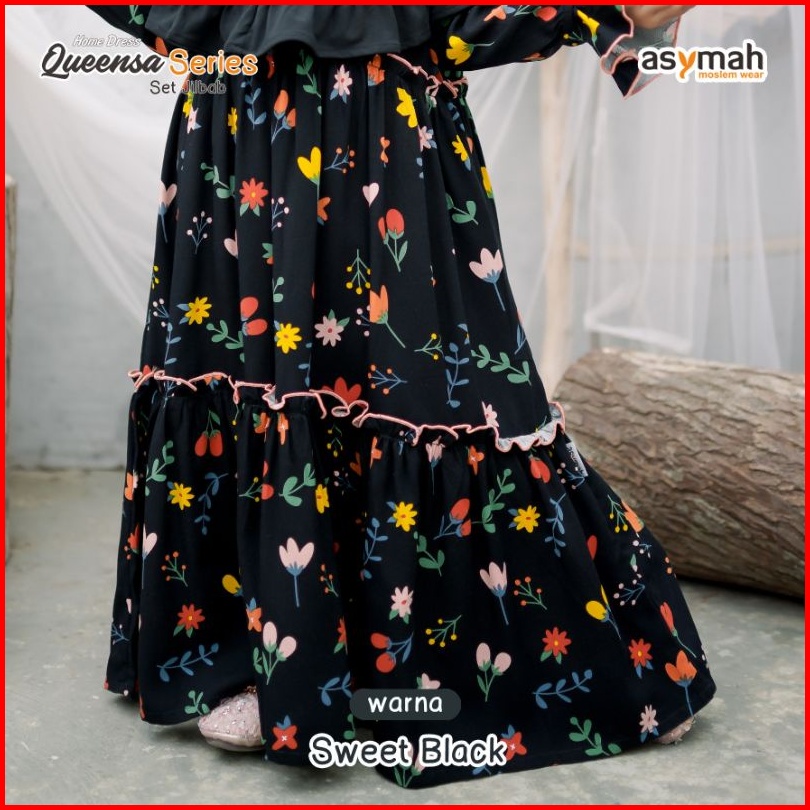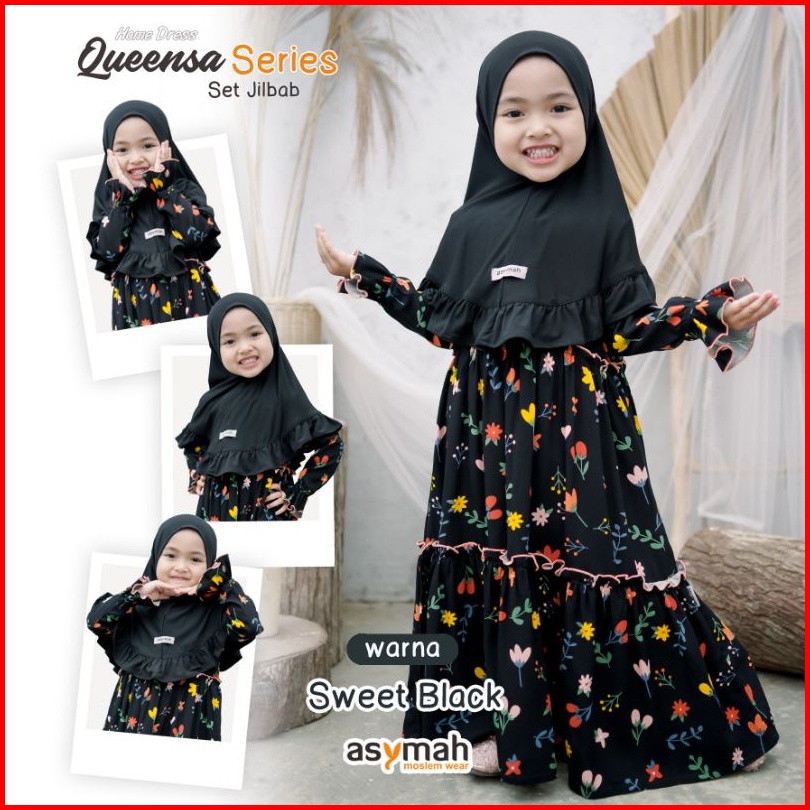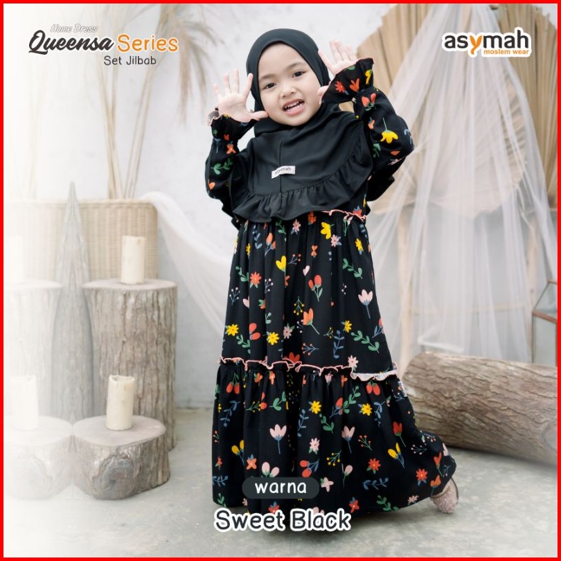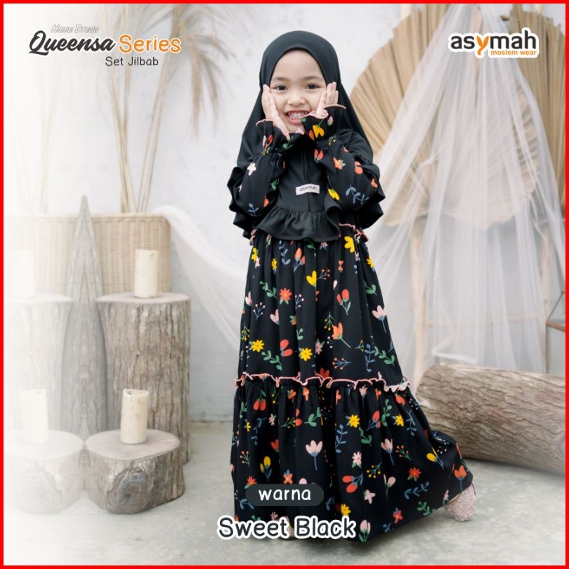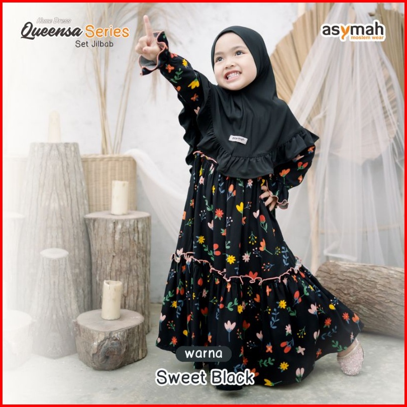 - Gamis Anak Rayon Set Jilbab Warna Hitam Bunga Bunga - Queensa Dress