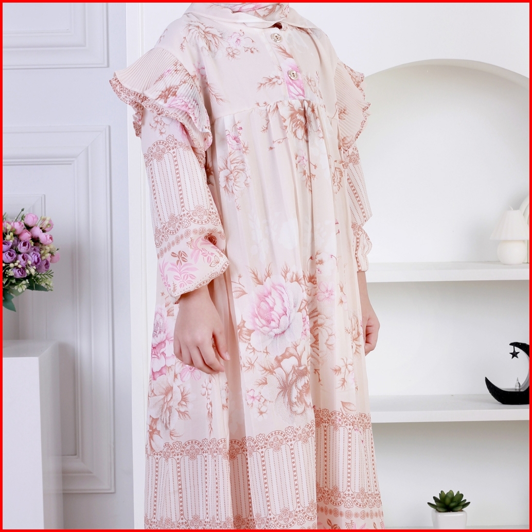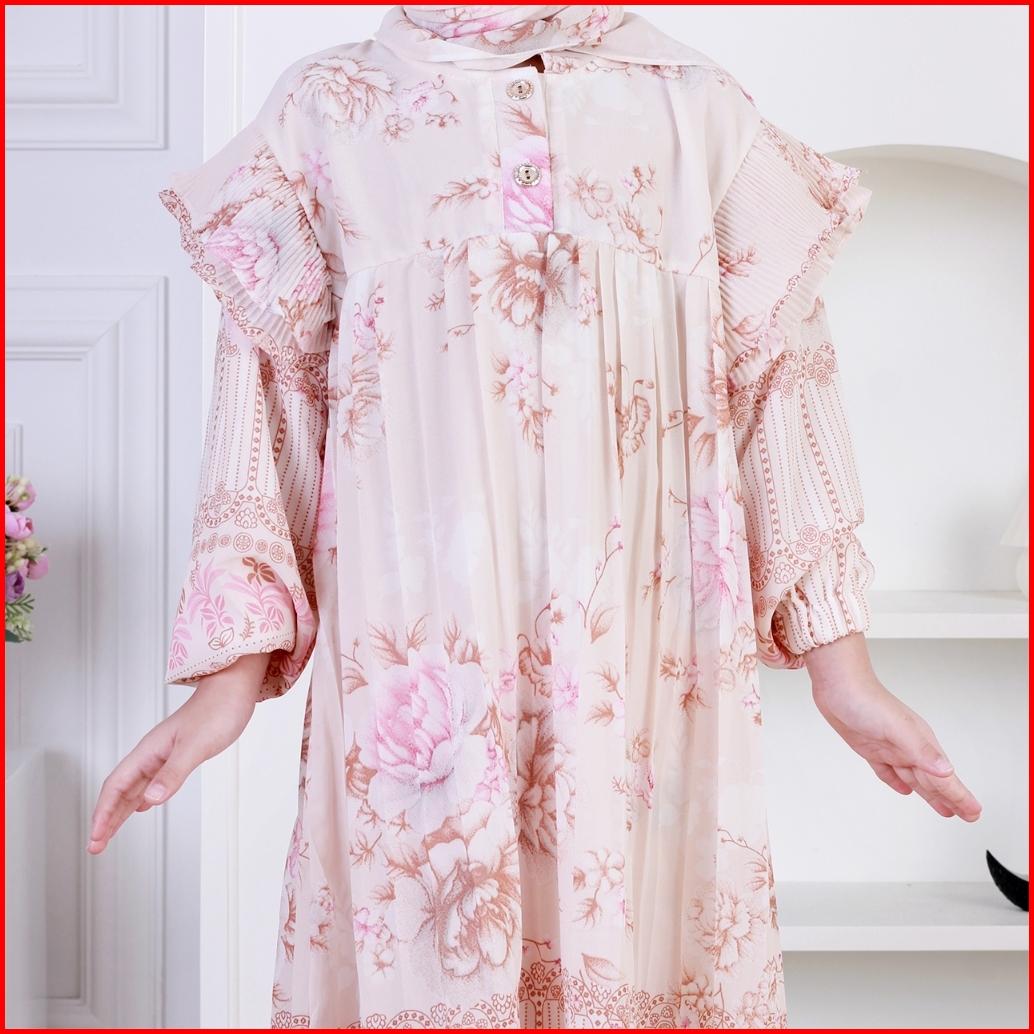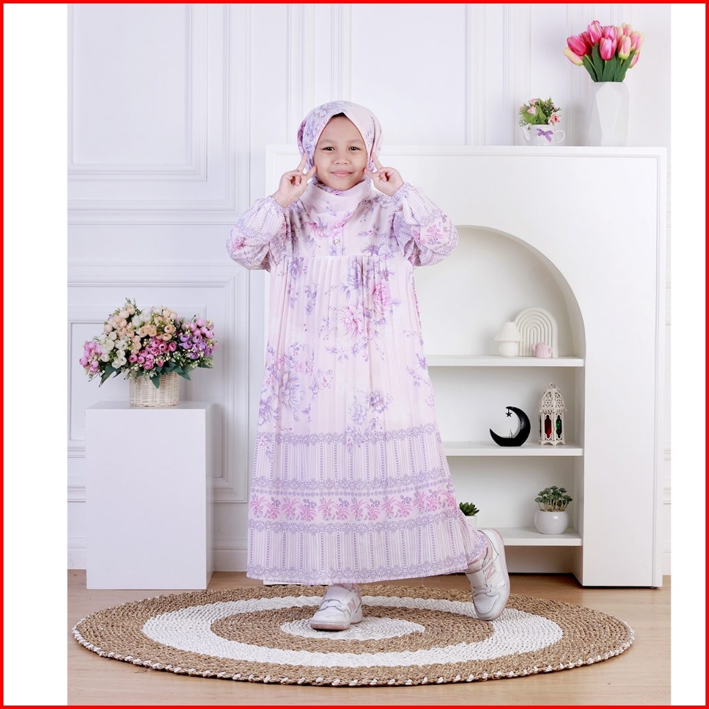 Dungdungkids Gamis Anak Vanesha Ceruty Motif Bunga Plisket Free Jilbab Segi Empat 5 - 11 Tahun