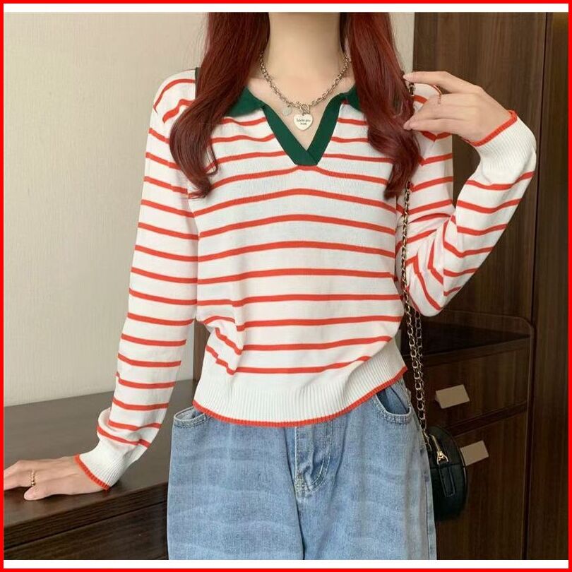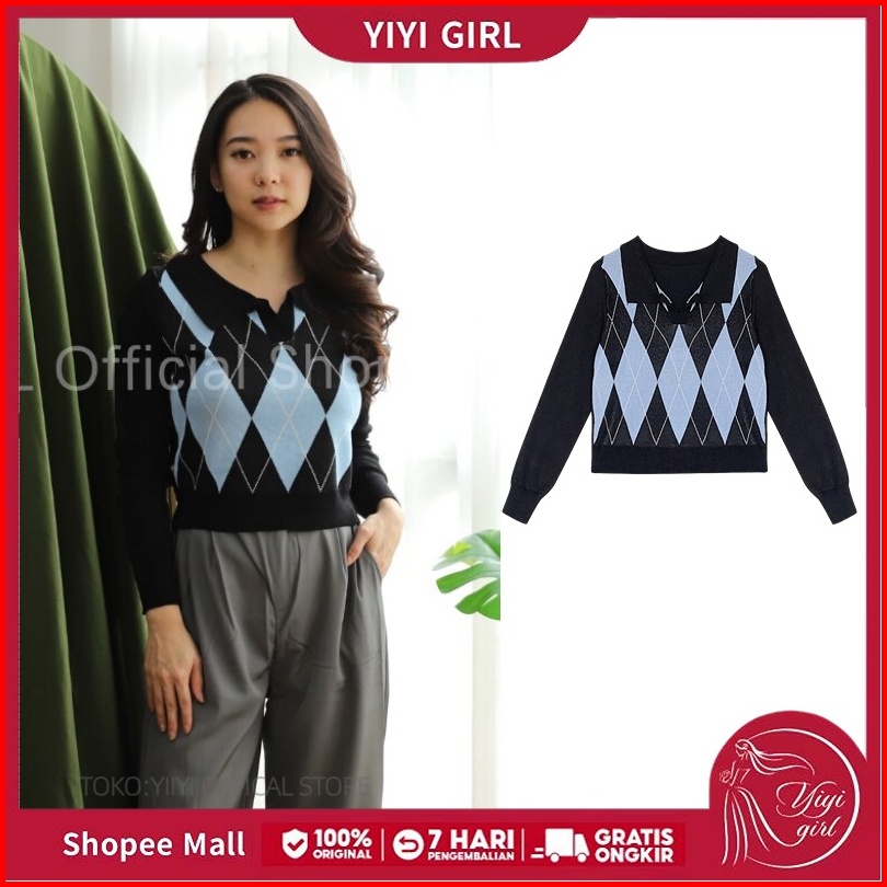 Yiyi Girl Atasan Rajut Atasan Rajut Kotak-kotak V-neck Wanita Crop Top Lengan Panjang Blouse Korean Style