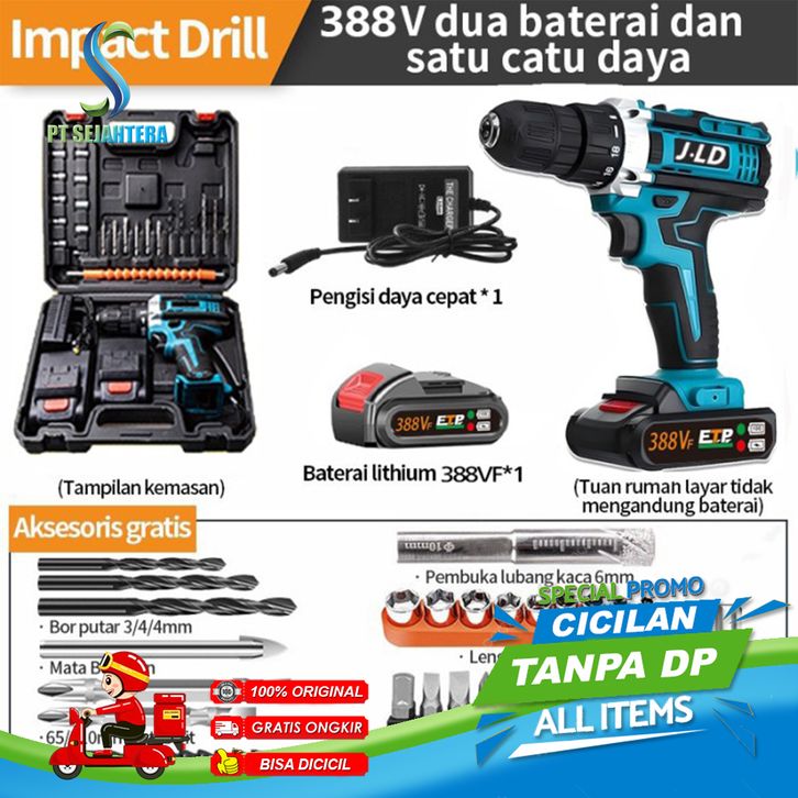 JLD Mesin Bor Listrik Bor Baterai Bor Tanpa kabel 388V Set Lengkap - BIru 1 Battery TERLARIS