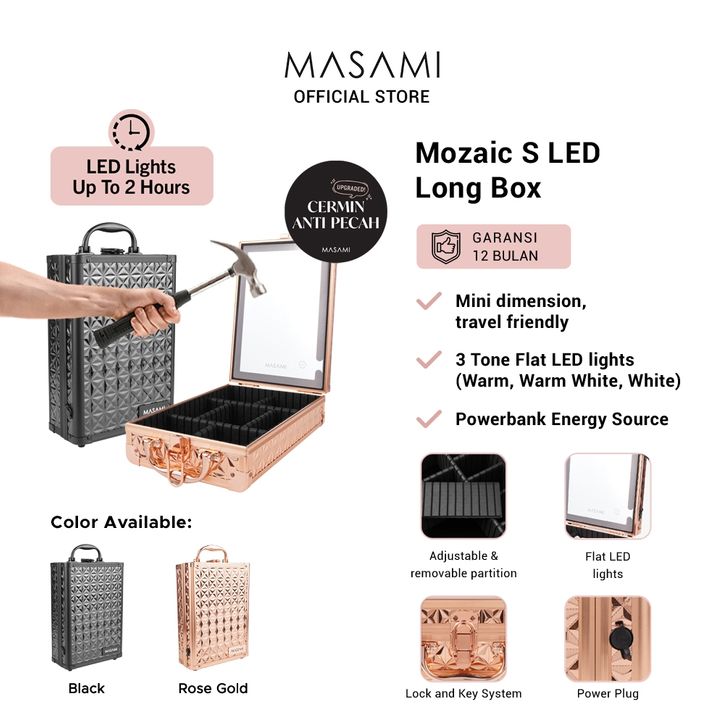 Masami S Led Long Box Black Mozaic 21x30x10cm Beauty Case Rose go'ld Koper Black / Tas Kosmetik / Make Up Case /